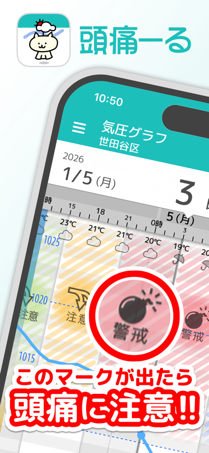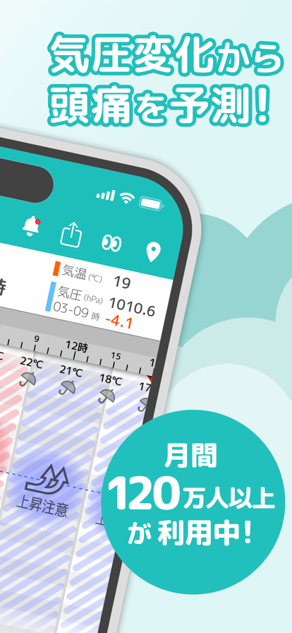 累計2000万ダウンロード突破、毎月100万人が利用中! 気象予報士が考案した気圧予報に基づく体調管理アプリです。 一時間毎のわかりやすい気圧予報グラフで不調を予測・確認できます。 手軽に記録をつけることができるので、体調不良の原因を振り返りやすくなります。 -----気圧とは…?----- 自分自身にかかってくる空気の重さ。なんと約15トン! 日々ダイナミックに変化し体調に影響を与えています。 -----こんな方におすすめです!----- 『旅行や大事な会議、なるべく頭痛がしない日を選びたい!』 『頭痛のきっかけが分かったら…心構えができるのに』 『雨の日の朝、きまって調子が悪い…』 『台風の日、寝込んだことがある』 『家族やペット、大切な人の体調管理がしたい』 『頭痛だけでなく、生理の記録もしたい』 (脳脊髄液減少症、線維筋痛症、片頭痛、鬱、不眠、睡眠不足、リウマチ、肩こり、関節や古傷の痛み、自律神経の不調などをお持ちの方にも) -----頭痛ーる機能紹介----- 【気圧グラフ】 - 約1.3日先(プレミアムだと10日先)までの気圧予報をグラフで確認できます。 - 気圧が通常より大きく下がる時にグラフ上にアラートが表示されます。 【記録機能】 - 1時間単位で4段階の体調と薬の服用の記録、メモの入力が可能 - 薬は市販薬と処方薬に分かれ、薬名も記録可能、一度に複数の薬を登録できます - 生理の記録も可能。生理周期の入力で次回生理の予測も確認できます 【痛みノート】 - 記録した内容をリストで確認 - 記録した時刻の天気や気圧等のデータを合わせて表示 【おしえてAI】 - 不調の記録を記録することであなたの痛みと気圧変化の関係性をAIが分析 - 分析した結果からあなたの不調の原因をパターン化 - たくさん記録を付けることで分析精度が向上します。 【PetVoiceデバイス連携】 - お散歩ログ:愛犬とのお散歩のルートと距離を計測し、頭痛ーるで詳細に表示 ※PetVoiceにて種別を犬で登録された方のみ表示されます。 【その他】 - 全国マップ:全国主要都市の明後日までの気圧、天気、気温、最大風速、最小湿度の閲覧可能 - 頭痛警戒Push通知:頭痛が起こるような気圧低下が予想された場合にPush通知 - 地点登録:市区町村単位で地点登録(全国約1900か所の天気予報が利用可能!) - プライバシー設定:気圧グラフ、全国マップから地点情報、生理、痛み、薬記録、メモの表示/非表示を切り替えられます - 頭痛ーるコラム:・キャラクター達がわかりやすく!簡単に!気圧や頭痛について解説 - お天気キャラ:・ふくろう博士、マロ、謎のてるてるネコ。ゆるかわいいキャラクター達には、秘密のストーリーが!? - help&規約・よくある質問・データ取り扱いについて・利用規約・規約等は必ず確認してお使いください。 -----頭痛ーるプレミアム会員で追加される機能紹介----- - みんなの痛みナウ:自分以外に体調を崩している人がどの程度いるかを確認 - 気圧グラフ:10日先までの予報を確認 - データ連携機能:ウェアラブルデバイスとのデータ連携で睡眠時間や心拍数が確認できる - ウィジェット:ミディアムサイズのウィジェットが追加 - 週間天気予報:天気と気圧予報を一緒に確認できる - 痛みカレンダー:カレンダー表示で記録を付けた日を一目で確認 - 痛み月別レポート:痛み回数、服用回数、記録時間等の月別集計で傾向把握 - 地方マップ:都道府県毎の気圧予報と天気予報をチェック - マイ通知:登録地点で今日か明日に気圧低下が予想される場合にPush通知 - 記録期間:記録期間が無制限、過去の記録も遡って確認 - 広告非表示:気圧グラフと痛みノートの広告が非表示。表示エリアが増加 -----頭痛ーるプレミアム・ファミリーケア会員で追加される機能紹介----- - プレミアムサービスの全ての機能 - 家族の体調を個別に管理できるアカウント機能が追加。追加できるアカウント数は3つ ※Appleの提供する機能「ファミリー共有」ではございません。 -----頭痛ーるプレミアム・ファミリーケア+会員で追加される機能紹介----- - プレミアムサービスの全ての機能 - 頭痛ーるプレミアム・ファミリーケアの全ての機能。追加できるアカウント数が7つに増加 - ペット専用の痛み記録が追加。チップ機能で日々の記録が簡単に ※Appleの提供する機能「ファミリー共有」ではございません。 -----各種お問合せ----- - よくある質問 https://zutool.jp/app/faq.html - プレミアムサービスの利用規約 http://biz2.otenki.com/index.php?uid=NULLGWDOCOMO&mmmsid=bbtenki&actype=page&page_id=app_tos_premium#app_tos_premium - プライバシーポリシー https://www.otenki.com/app_privacy.htm - その他、不具合等がございましたら下記メールアドレスまでお問合せ下さい。 zutool-info@h-medtech.com - 参考 Kenneth J. Mukamal, MD, Gregory A. Wellenius, ScD, Helen H. Suh, ScD and Murray A. Mittleman,MD,DrPH(2009).Weather and air pollution as triggers of severe headaches.Neurology, 2009; 72: 922-927 国際頭痛学会「京都頭痛宣言」(2005年10月) 頭痛診療への誘い~若手医師、医学生の皆さんへ~「プライマリケアの現場において」日本頭痛学会ホームページ http://www.jhsnet.or