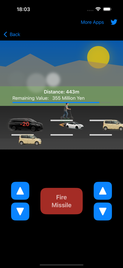 一款以高级轿车在高速公路上疾驰的横向射击游戏。 用导弹击飞缓慢行驶的轻型汽车,恢复残值! 尽可能延长行驶距离。