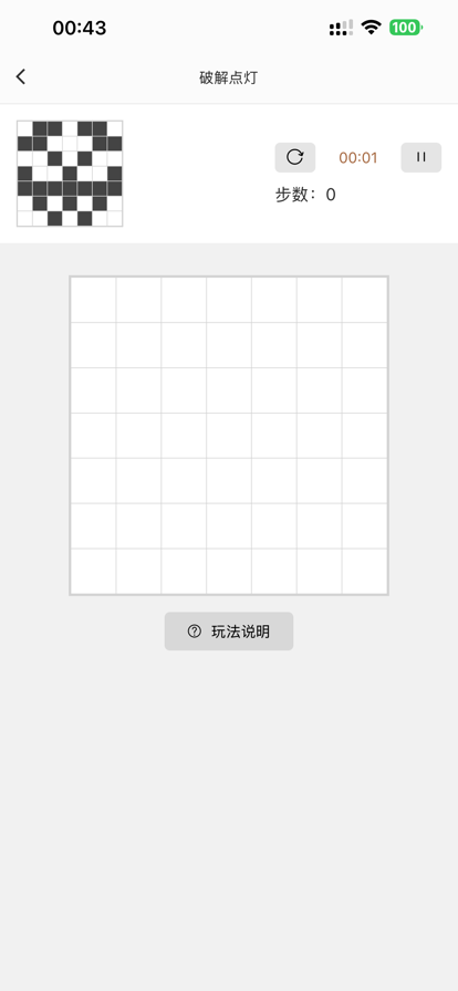 考验空间想象力! 点击操作盘上的任意一个格子,格子本身和上下左右4个格子都将反色(原来是白色变成黑色,原来是黑色变成白色),采用该基本规则拼凑出目标图形。 游戏目前有100个关卡,由易到难,后续关卡持续放开。