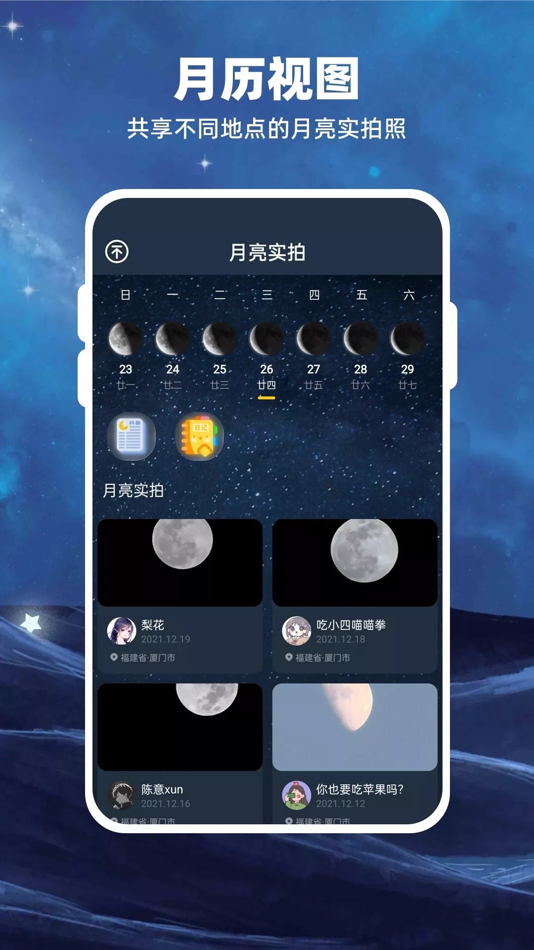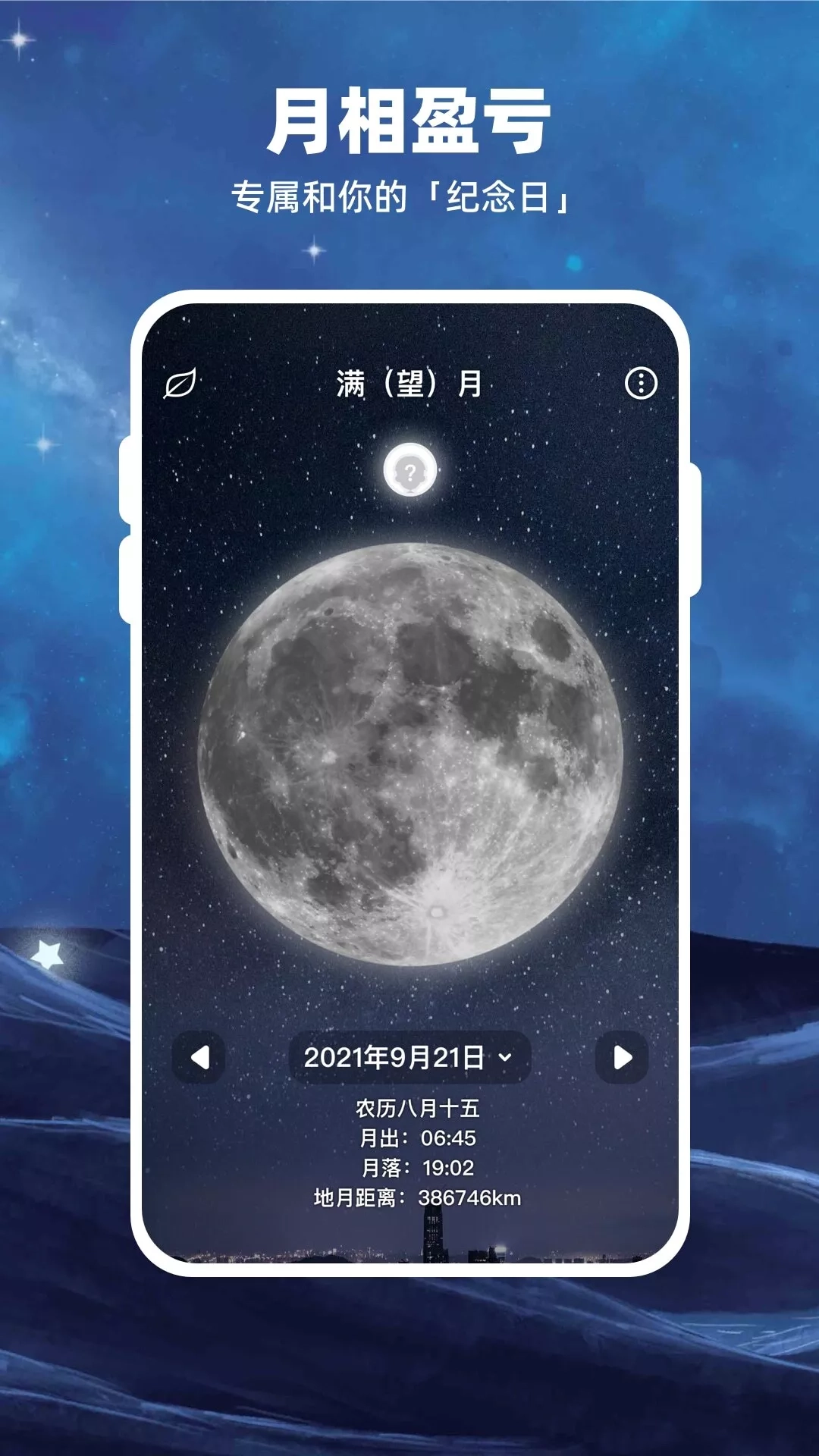 月球兔【Moon月球】是一款源于月亮而诞生的治愈系浪漫主题App。 在这里,你不仅可以查到出生那天的月亮,还可以获取月亮美图,随时上传Moon实拍,分享生活中的浪漫治愈瞬间。 也许你有许多小秘密要说给月亮听;也许你想给喜欢的TA制作一份独一无二的生日礼物;也许你希望月亮伴你入眠;也许你想更了解月亮和宇宙……在这里,你可以找到属于你的小美好。 【Moon】想知道每一天月亮的姿态吗,切换日期即可拥有!从月升月落时间到地月距离、从方位角到农历日期...还有你所不知道的诗意月相名,月亮美图更可一键保存! 【Moon实拍】人有悲欢离合,月有阴晴圆缺,共赏此刻你所见的月亮! 【3D探月】3D视角,带你感受月球探索的魅力。 【月相日历】展示每天的月相,记录每日的心情。 【地月模式】酷炫的3D动态地球与月亮,可以任意操作调整角度观察,还可以设置为桌面壁纸哦! 【更多模式】 纯净模式:单纯而美好的星空与月亮,可以听音乐和弹奏小星星哦,治愈感满满! 【更多小工具】 爱豆星:看爱豆出生那天的月亮!开启爱豆星再调整日期有小彩蛋哦 树洞:温暖的情绪树洞,倾诉心事烦恼,也可作为日记使用记录日常。 秘月:想和好友贴贴?快使用秘月霸占他的屏幕! 制作月相:精美月亮图快速制作保存。 星座运势:今天的你幸运色是什么呢? AR星图:打开AR模式搜索星座、月球,跟随指示即可找到方位! 悬浮星:让TA代替月亮陪伴你。 桌面插件:天气、月球、心情树洞、习惯打卡、纪念日、倒数日... VRSpace:探索宇宙空间站。 决定盘:小决定大转盘拯救选择困难症! 科普文章:有关月球的冷知识,好奇吗? 潮汐:港口潮汐表实时查询。