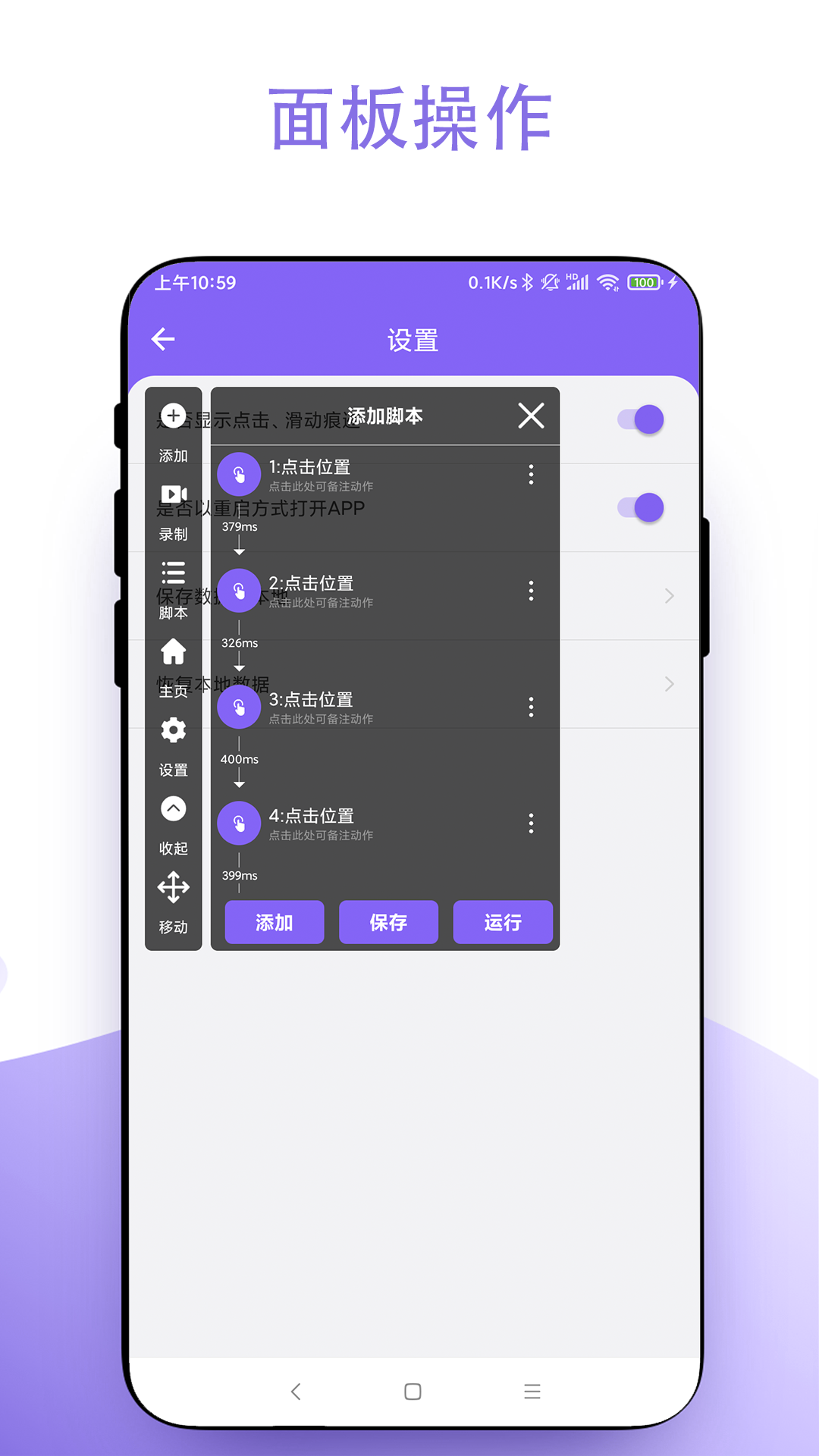 图灵自动点击器是一款更专业更好用的自动点击器,可以解放您的双手,帮您做重复的屏幕操作。它可以根据用户的设置自动执行屏幕手势操作,也可以轻松录制自己的手势,添加自定义操作,定时执行任务,自动点击器连点器的不二之选。<br><br>特点:<br>1.点击速度更快,每秒最快可连点1000次;<br>2.支持悬浮秒表功能,配合点击器使用可极大提高抢购成功率;<br>3.支持更多手势,可添加点击、长按、直线滑动、曲线滑动、缩放、返回、显示最近任务、显示主页和显示通知栏等手势操作;<br>4.支持多指手势功能,可实现同时多指点击、滑动或者缩放等操作;<br>5.录制手势更方便,可完美复现您在屏幕上录制的复杂手势操作;<br>6.支持分享、储存和加载脚本,方便与朋友分享操作。<br>7.支持定时执行任务,支持倒计时或者指定具体时间;<br>8.支持自定义控制界面;<br>9.支持手势编辑器,可在手势添加过程中随时调整某个手势的参数和位置,修改、新增或者删除手势,无需全部重新录制;<br>10.运行控制栏可显示运行信息和进度,可随时开始、停止、暂停或恢复脚本的运行;<br>11.支持反检测机制;<br>12.界面简洁,逻辑清晰,很快就能熟练操作。