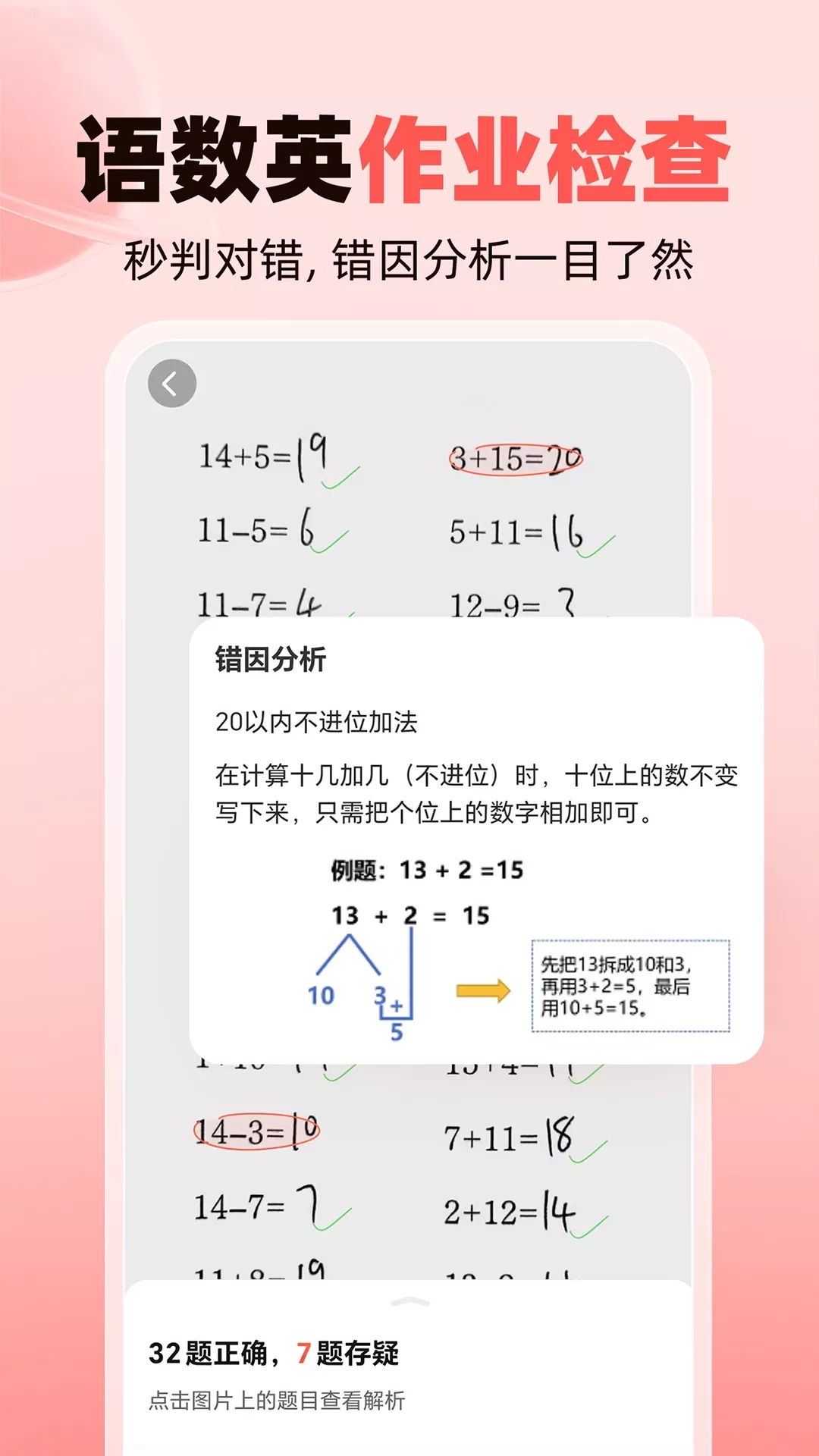 ※※ App简介 ※※ 「小猿AI(原小猿口算APP)」是一款专为中小学生打造的教育AI。AI赋能帮助家长、老师减轻作业检查负担。小猿AI不仅是一个APP,更是通过AI技术深度重构学习流程的教育AI伙伴。 对学生:从“被动学习”到“主动攻克”,AI让成长路径清晰可见。 对家长:从“焦虑陪读”到“科学监督”,节省时间并降低亲子冲突。 对教师:从“重复劳动”到“精准教学”,赋能课堂效率提升。 小猿AI隶属于猿辅导在线教育旗下。猿辅导在线教育,全国中小学生和家长优选的在线教育品牌。公司旗下拥有猿辅导、小猿AI、小猿搜题、斑马AI学等多款在线教育产品,为用户提供网课、智能练习、难题解析等多元化的智能教育服务,帮助学生系统性、高效率的完成学习闭环。 ※※ 功能介绍 ※※ #小猿AI核心价值:AI深度赋能学习全流程,解决学习痛点,重塑高效学习。 「小猿AI = 省心家长 + 高效学习」 对孩子:学习变有趣,错题有人教,学习提升快。 对家长:每天少焦虑,辅导更科学,亲子少冲突。