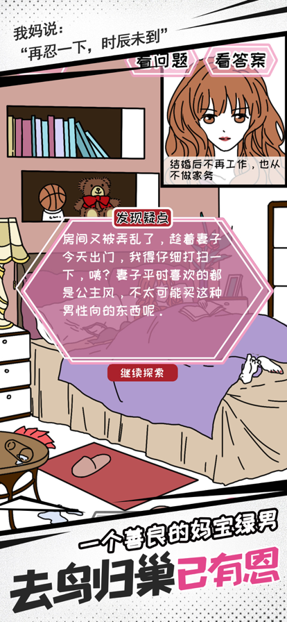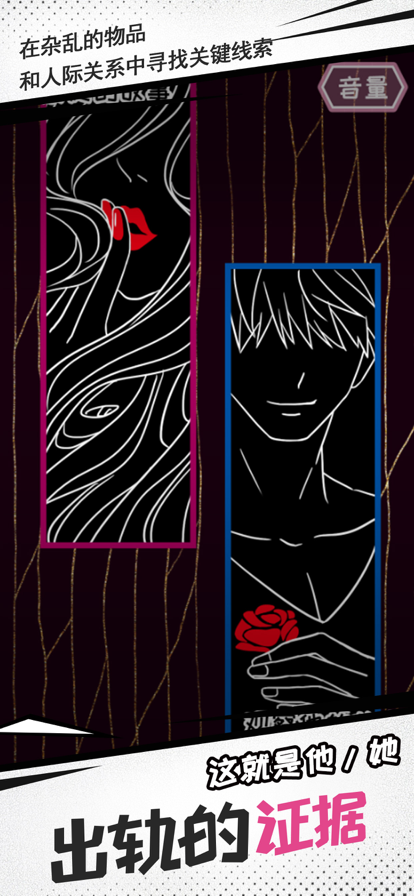 荒唐却真实得令人发指的故事: 一个善良的妈宝绿男 一场互带绿帽的捕猎竞技 ...... 究竟,发生了什么?! 在寻找劈腿证据的同时,追踪背后隐藏的故事 我们承诺,游戏中涉及到的所有劈腿故事,均真实可考 根据人气博主【妖姬葵】收录整理的微博投稿改编 【游戏玩法】 他\她出轨的证据究竟在哪里? 轻松休闲的解密小游戏 只有成功收集到出轨物证据, 才能推动剧情,解锁结局。 祝你好运~ 欢迎加入TOT工作室QQ群:894646417