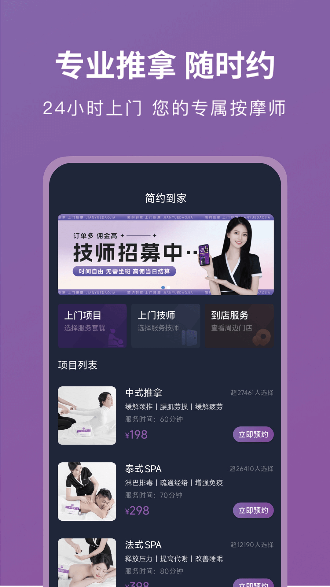 按摩到家是不断追求创新的上门按摩服务平台,提供正规、安全、便捷的24小时上门推拿服务,不管您是在家或在公司,都可以获得高品质的按摩体验。<br><br>【功能介绍】服务平台全程监督、担保、交易无忧,未服务全额退款;方便快捷一键定位,找到城市附近的海量按摩技师,轻松一键预约;随时查看技师动态视频、图片内容,方便选择真实的,有实力的技师或商家。<br><br>【服务分类】包含中医推拿,油压按摩,足疗足浴,刮痧,采耳,艾灸,拔罐,保健理疗,经络调理,经络理疗,肩颈按摩,精油按摩,精油开背,全身推油,美容美甲,产后康复,小儿推拿,清肠排毒等按摩项目。包含中式按摩,泰式按摩,港式按摩,美式按摩,欧式按摩,日式按摩,韩式按摩等按摩手法。<br><br>【开通城市】已开通北京,上海,深圳,广州,杭州,重庆,成都,南京,东莞,郑州,苏州,西安,长沙,合肥,太原,厦门,武汉,福州,天津,青岛,贵阳,昆明,珠海,银川,佛山,沈阳,南宁,商丘,无锡,南昌,大连,惠州,长春,泉州,保定,常州,兰州,中山,廊坊,济南等全国大多数城市。<br><br>【平台优势】<br>1.平台担保:资金和人身安全有保障,电话保密技术,避免骚扰电话<br>2.收费透明:明码标价,商家与技师多种多样,总有适合自已的服务<br>3.活动丰富:预充值领现金,优惠卷送不停,还有更多折扣福利<br>4.真实技师:平台人脸识别认证技师,技师动态内容立体式展现真实<br>5.品质保证:平台与商家双重监督技师,双向质量反馈机制,让您放心