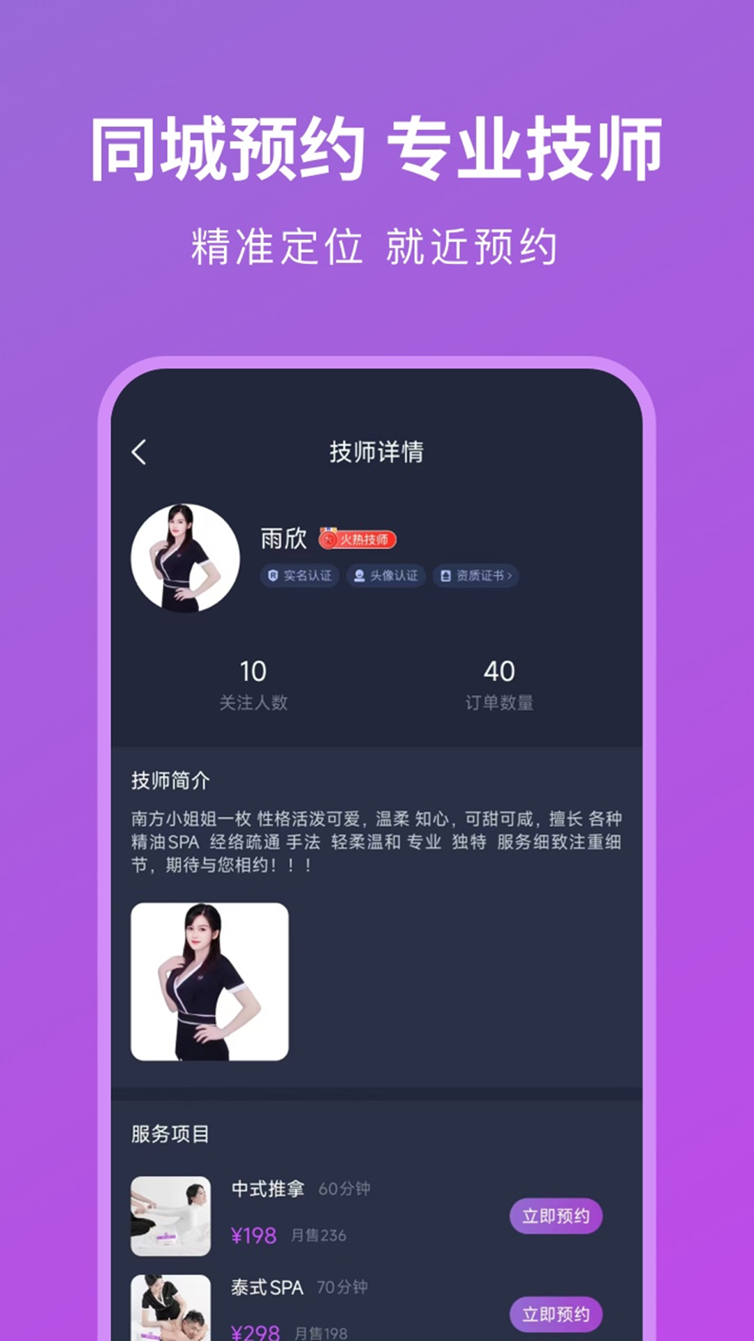 你点到家成立于2021年,服务于上门养生推拿垂直领域。提供的项目包括:中医推拿、精油养生、理疗保健、经络SPA等项目,为用户提供高价值高标准的健康养生、理疗保健的体验,极速的上门服务。<br><br>--关于你点到家--<br><br>【你点到家】是一个以推拿按摩为主项的个人定制型o2o平台,向广大喜好养生人士提供专业、正规、安全、便捷的24小时上门按摩推拿保健服务。<br>在这,您可自由通过在线选择项目、下单、支付,进行预约上门按摩。<br>技师收到你的支付订单会立马联系你的。<br>【新人礼包】新用户上线即送100元礼包卷,下单立减<br>【预约按摩】24小时预约,就近安排按摩技师上门<br>【平台担保】价格透明无额外收费,按摩技师爽约包退款<br>【真人认证】实名认证,持证上岗<br>【品质项目】精选服务,高品质项目<br>【客服支持】客服电话:400-007-1685