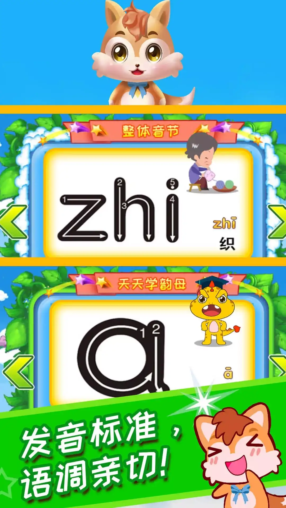 儿童宝宝学习拼音和汉字的好帮手! 拼音是认识汉字、学好普通话的基础, 在孩子学习语言的过程中起着重要的作用。 《儿童拼音王国》寓教于乐,融合了拼音笔顺、词组发音、卡通插图以及朗朗上口的顺口溜。 结合图形卡片以发散形记忆方式,让儿童更快的掌握标准的拼音发音。掌握了拼音技能后就能自己学习唐诗国学,看故事书绘本等。 【软件特点】: 1、学习模式:包括声母、韵母、整体音节;结合动画进行学习;学习字母的书写;学些拼音的拼读;学习拼音对应的汉字; 2、测试模式:学习完成后,可以对韵母、声母、整体音节测试,也达到了巩固记忆的效果。