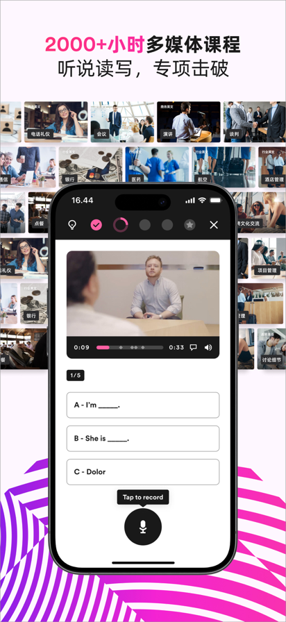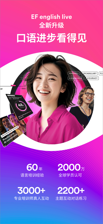 学英语找不到方法,没有系统化的学习规划?想到一点学一点,看不到进步?EF English Live全新升级为EF成人英语,为你提供精准的学习帮助!这里有视频、词汇测验、发音校对、语法纠错、阅读练习等多元形式,包含商务谈判、职场邮件、留学面试、旅游问路等多个对话场景,边玩边练口语超轻松!依托 CEFR 16 级科学分级,不管你是新手还是进阶者都能精准提升。手机、电脑、平板还能同步进度,学习随时续上~ 你的英语进阶,从这里开始! EF教育,60余年全球教学经验沉淀,提供商务英语和通用英语课程,拥有3000+专业培训师,每年教授200万堂课,迄今为止有2000万名学员,想学地道英语就找EF! 【告别无效学习,EF让口语进步看得见】 • 真人老师更懂你:中英双语培训师,懂你的需求和痛点,提供个性化的纠正反馈 • 互动式的学习方法:先进的在线学习技术,沉浸式的线上课堂,海量的对话练习,灵活的学习安排,让你的口语进步快人一步 • 简洁的应用程序设计:助你从学习英语初期就培养有效的学习习惯,保持学习动力 【专业培训师教学,与全球学员一起学英语】 • 可在任何设备上全天候和培训师上课 • 基于你的目标、日程安排和预算,为你定制目标清晰的个性化学习计划 • 预定和三重认证的EF培训师的1对1私人会话课。培训师助你设定目标,克服挑战,为你的成功喝彩,让你收获的不止是英语 • 在EF培训师的引导下,和来自世界各地的学员一起参与在线互动课堂 【丰富多媒体课程,随时随地开启对话】 • 作为在线私人会话课和在线互动课堂的补充,你可随时随地学习超过2000个小时的多媒体课程 • 随时随地开启2200+主题对话练习,智能反馈。从职场到日常生活,提升你的英语能力,让你下次开口更有信心 【解锁口语进步,追踪 EFSET 分数,学习进度实时掌握】 • 完成5节私人会话课后,解锁你的EFSET口语专项分数,从单词量、流利度、连贯性、准确性四大维度清晰看到你的进步 • 使用视频、词汇测验、英文阅读练习、语法游戏和写作任务来进行英文口语练习 • 符合国际语言标准CEFR(欧洲语言共同参考框架)的16个级别的英语学习 • 全面的英语分级测试 • 学习进度可在手机端、电脑端和平板端同步更新
