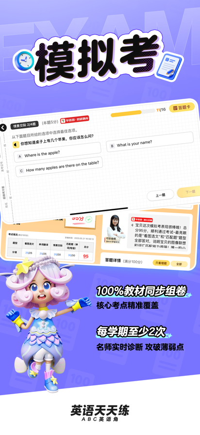 英语天天练在线学习规划功能,学习更高效、家长更省心! 英语天天练是30万所学校和5000万高效小学生的共同选择,覆盖国内85版本英语教材、百万历年真题、负责1对1老师讲解,并讲述了新课标校内同步学习内容。帮助孩子学英语,开口读,实现真正的校内大声“同步学”! 安装最新的DeepSeek大模型,助力高效英语学习! 【周中沉思学+周末趣味练习】 1、模式自由切换,匹配学习状态:家长可根据孩子当日精力与注意力,灵活选择“周中静学”或“周末课堂练习”模式,实现个性化学习安排。 2、合理安排学习节奏:张弛有度的安排,孩子更容易长期坚持学习。 【每日学习打卡】 1、每日学习规划,聚焦核心内容:基于当前学习阶段智能规划每日核心高效词句与知识点,确保学习内容精准。孩子每日完成至少20道题,5天掌握一个单元核心知识。 2、兴趣启发,激发孩子的学习兴趣:北极学习勋章启发等体系,让孩子在成就感中轻松养成主动学习习惯。 【哈佛外教伴学】 1、哈佛外教领读:每句英语开口,均由哈佛外教领读,以纯正美式发音逐句示范,还原真实语言环境。促进孩子大声开口读英语,告别“哑巴英语”! 2、哈佛外教讲解:学习过程中遇到的问题错题,都有哈佛外教老师详细讲解、逐题分析,为孩子巩固知识点。每日学习结束,还会生成专属报告,在家长端可以随时与外教沟通,了解孩子学习情况。 【模拟考】 1、权威题库校内同步组卷:精选学而思教研题库,严选校内同步试卷。 2、精准诊断薄弱点:模拟本学期期中/期末考情,精准定位知识薄弱点。 3、AI精讲,查漏补缺:AI老师智能讲解,深入分析,帮助孩子有效查漏补漏,强化强化。 【背单词】 1、校内教材同步:对标校内教材,覆盖人教版本/外研社等85个版本校内同步教材,立体化解释单词内容,为您学习之路保驾护航。 2、DeepSeek AI科技加持:基于艾宾浩斯遗忘曲线,接入人工智能AI程序LSTM(长短期记忆神经网络),让孩子拥有自己的记忆方案,每个科学背单词。 3、拓展能力助提升:这里还包含剑桥、新概念、RAZ等知识体系,参考欧洲语言框架标准中对英语听、说、读、写能力的要求;设定适合中国孩子的英语学习大纲,提高英语水平更上一层。 【刷真题】 1、个性化真题练习:题库覆盖34个省份,题目数量高达百万。基于DeepSeek和智能算法,为孩子个性化的本地真题。 2、精准知识点巩固:根据孩子所选教材、年级和单元知识点,每轮20道题精准,帮助孩子巩固单元知识点、重难点和常考点。 3、AI老师示范一讲解:每道题都有一位AI老师详细讲解易高效错点和做题技巧,帮助孩子掌握常考点和做题技巧,学习。 【读课文】 1、利用即开口:每一个互动都需要英文开口来完成,打通孩子欠缺开口的心理缺口。通过多种方式保证每个孩子每分钟开口2次以上。 2、开口大声读:随着开口数量的增加,孩子在全英中不知不觉的开口大声,解决令中国开口“不敢开口”的问题。 3、还原校内课文:每个单元的互动练习都有校内课文篇章,配备领读音频,结合学习激励让孩子反复朗读,掌握课文内容。朗读结束后,还会生成带标签排行榜的报告,家长随时查看孩子的学习情况。 【自动订阅服务说明】 【VIP订阅名称】连续包年(会员免费试用) 【VIP订阅周期】12个月,连续包年。 【VIP订阅价格】368元 【VIP取消续订】打开苹果iOS设备上的“设置”->点击“Apple ID、iCloud、媒体和购买”->点击“订阅”->选择英语天天练->取消订阅。 【免费试用】用户有3天的免费试用时间,3天内任意时间取消订阅不会收取任何费用。 【SVIP订阅名称】SVIP连续包年 【SVIP订阅周期】12个月,连续包年。 【SVIP订阅价格】898元 【SVIP取消续订】打开苹果iOS设备上的“设置”->点击“Apple ID、iCloud、媒体和购买”->点击“订阅”->选择英语天天练->取消订阅。 【会员开通及连续包年协议】https://app.chuangjing.com/editor/preview?projectId=1058 【用户协议】https://app.chuangjing.com/editor/preview?projectId=992 【用户个人信息保护政策】https://app.chuangjing.com/editor/preview?projectId=1128 【使用条款(EULA)】https://www.apple.com/legal/internet-services/itunes/dev/stdeula/