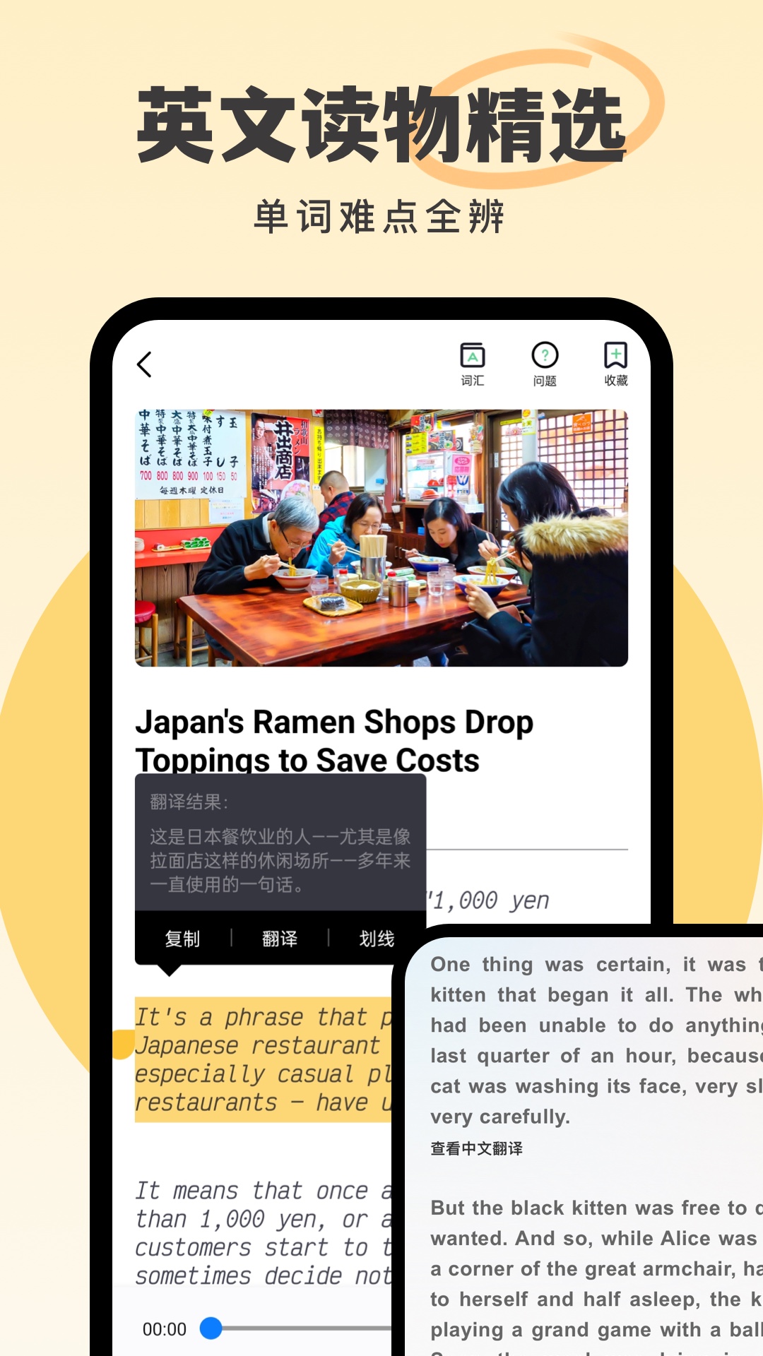 每日英语阅读,专为英语学习者打造,精听细读助你更好学英语。软件不仅会根据你的英文水平,每天推送地道的短文和原著,更有文件导入、单词本学习等功能,等你来体验。每天十分钟,养成阅读好习惯!<br><br>【资源丰富,每日更新】<br>编辑精选的英语文章,只需三分钟,轻松积累实用词汇,学习地道鲜活表达;<br>丰富的英文读物:经典名著、短篇小说、少儿读物、名人演讲......原声朗读、双语字幕,带你感受原汁原味的阅读体验;<br>精听党:名著原声朗读,高亮双语字幕,结合干货知识点讲义和课后习题巩固,再也不用担心名著读不懂啦。<br><br>【每日外刊,深度专业】<br>选自主流的英美外刊,美国本土外教纯正发音朗读;<br>专业英语教师逐字逐句精讲,单词、语法、发音知识一网打尽;<br>每天2-3道练习题和配套答案详解,助你测评当天学习效果。<br><br>【功能强大、操作便捷】<br>划词搜索:与《欧路词典》无缝集成,长按查词,即指即译;<br>播放调节:8档语速调节、4种译文切换,满足不同阶段的学习需求;<br>智能提示:重点单词、各大考试(四六级、考研、托福GRE雅思等)的高频词,可在文章中自动标注,单词学习更高效;<br>生词学习:文章中长按即可查词并加入生词本,全平台同步,更有卡片播放等复习模式助你学习;<br>统计图表:每天的阅读记录都会通过图表生动展示,记录你一点一滴的坚持与努力;<br>阅读提醒:同学,今天是不是忘记阅读了?不要紧,软件每天都可以按时提醒你。<br><br>【文件阅读,即点即查】 <br>您可以导入需要阅读的文献,支持PDF和ePub格式<br>阅读时即点即查,省却查词时复制粘贴的烦恼,阅读效率大大提高<br>支持添加批注,随时记录你阅读时的所思所想<br><br>【联系我们】<br> 客服电话:400-920-1209<br> 客服QQ: 1047518732<br> 电子邮箱:help@eudic.net