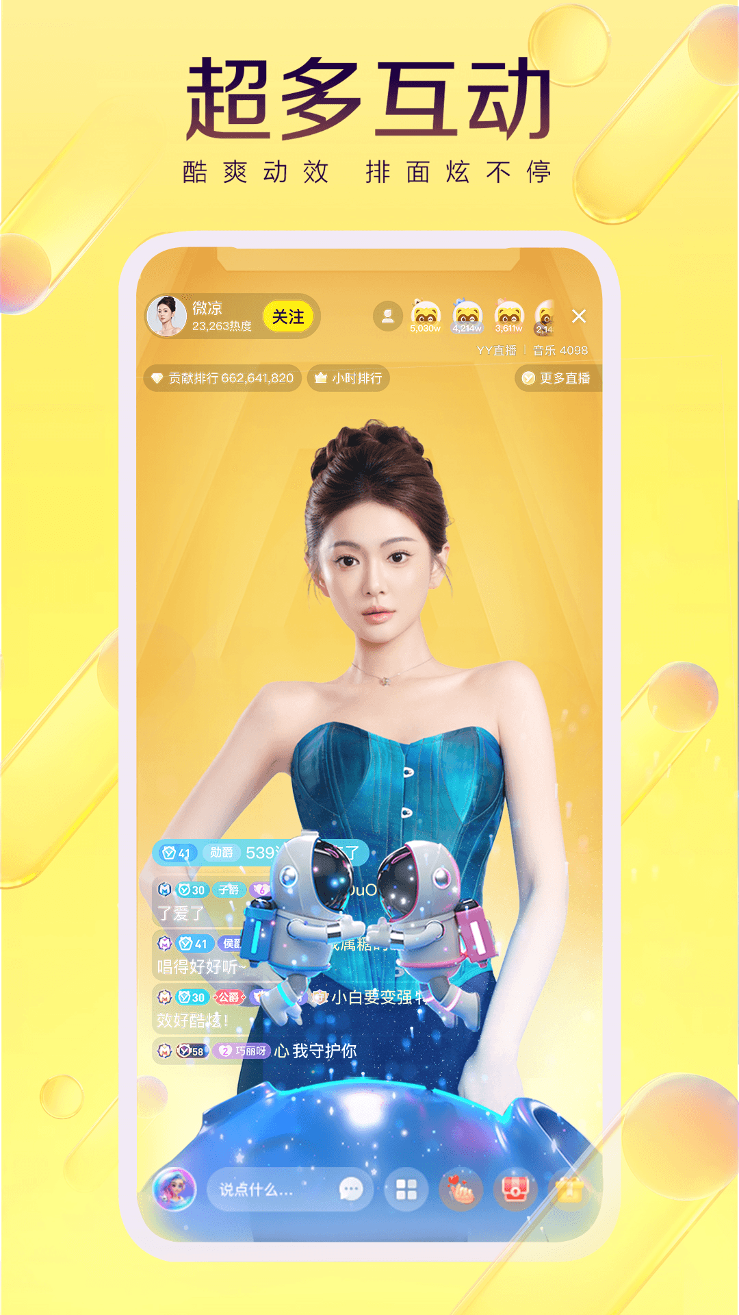YY直播,让你的快乐更简单!嗨歌热舞、觅友聊天、颜值佳人、相亲约会...你想看的这儿都有!海量主播与你实时互动,高颜值女神男神在线零距离!足不出户,发现身边有趣的人,和附近的人在YY不期而遇!YY让您不孤单!<br><br>【海量内容 颜艺看不停】<br>网红大咖直播秀, YY直播带你感受美妙的视听盛宴。唱跳喊麦、户外探险、体育竞技、游戏解说、新时代等,24小时超清直播不间断,直播你不知道的精彩生活。更多好看好玩的直播内容,就在YY直播!<br><br>【附近直播 喜爱零距离】<br>一键邂逅真实帅哥美女主播,开启同城热聊,轻松查看附近的人动态、直播,遇见兴趣相投的那一位。<br><br><br>【多人连麦 欢乐乐不停】<br>多主播同框互动,陪你聊天解闷、为你深情演唱、跟你撒娇卖萌!颜艺俱佳精彩不间断,直播间气氛拉满火热不停歇,随时随地找到你的快乐!<br><br><br>【超多互动 排面炫不停】<br>炫酷特效,给你专属排面!成为直播间焦点实力玩家,玩转全场。越玩越有戏,越玩越快乐。还有更多互动形式,等你解锁。<br><br>【实时搜索 精彩刷不停】<br>快速捕捉主播的实时动态和各种活动话题,爆款内容不停歇!个性化搜索推荐,推荐你所需要,找到你的快乐!还有更多不一样的世界,等你发现!<br><br>【意见反馈】<br>使用过程中遇到任何问题,请在应用内反馈:个人中心-意见反馈,我们会认真倾听你的每一条建议。<br>官方YY频道:YY10频道官方客服<br>新版特性<br>海量高清直播,精彩瞬间永不落幕~
