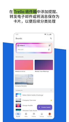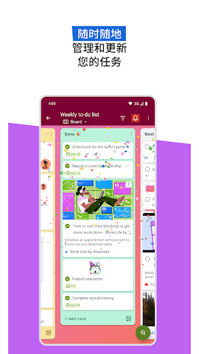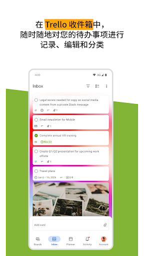 不再丢失便利贴,也无需跨应用查找收藏的消息。有了手机端 Trello,您可以利用该应用完成以下工作:<br><br>* <b>随时随地列出待办事项:</b>直接通过手机将任务、想法和笔记快速记录到 Trello 卡片—添加到期时间、评论、清单、描述、文件等。可保存 Slack 或 Microsoft Teams 等热门办公应用的消息、拍摄照片,或转发电子邮件至 Trello。人工智能还能帮助您将保存的待办事项汇总到 Trello 卡片,确保无一遗漏。<br><br>* <b>集中管理工作:</b>所有记录的内容均以卡片形式存入 Trello 收件箱,便于跨面板查看、确定优先级和整理工作。在 Trello 规划器中查看已安排的一天日程,该功能可与 Google 或 Outlook 日历同步。Standard 和 Premium 用户还可启用规划器,为完成已保存的待办事项安排专注时间。<br><br>* <b>创建美观灵活的面板:</b>将捕获的卡片整理到可自定义的看板和列表中,适配您的工作流程。Trello 移动端界面采用可触摸的可视化设计,支持拖放手势和面板间流畅切换,为您在移动设备上规划工作提供自然的方式。<br><br>* <b>通过 Android 小工具直接记录工作:</b>无需打开应用,即可从 Android 手机主屏幕创建新卡片。<br><br>* <b>轻松查看完整时间表:</b>启用与 Google 或 Outlook 日历同步的 Trello 规划器,即可查看当日已安排的日程(并为稍后要完成的 Trello 卡片中捕获的任务设置专注时间)。<br><br>* <b>获取适合您的提醒</b>:设置推送通知,以便及时获取您关注的更新(如到期时间、或卡片变更)提醒。 <br><br>* <b>离线工作</b>:即使没有互联网,也能记录想法和更新面板—重新联网后变更内容将自动同步。<br><br><b>下载 Trello,体验个人工作效率的新时代。完全免费!</b><br><br><i>当您使用需要访问设备照片、相机、麦克风或联系人的功能时,我们将在获取相关数据前请求您的许可。</i>