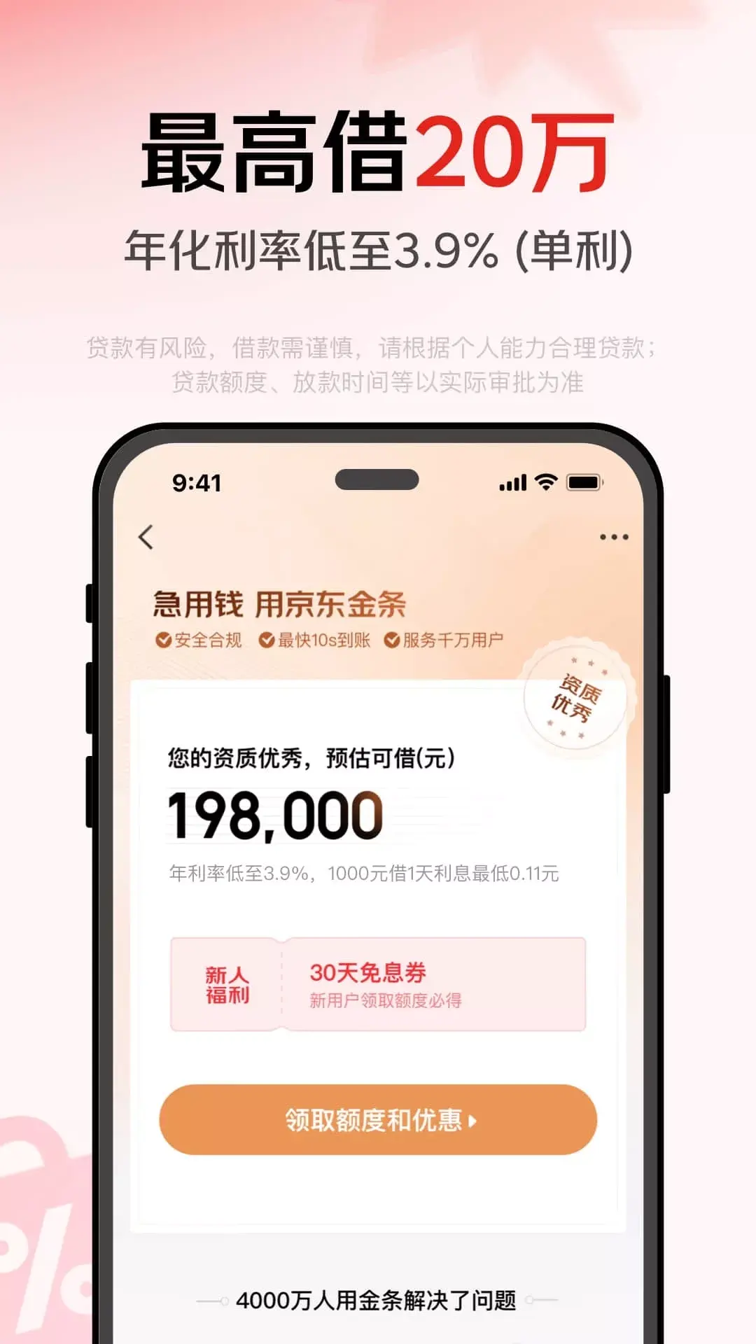 京东金融以智能化、内容化为核心能力,与银行、保险公司、基金公司等金融机构,共同为用户提供专业、安全的个人金融服务。 在这里你可以: 1、 理财:小金库、明星基金、黄金积存金等品类齐全,兼顾风险谨慎理财 2、 保险:医疗险、意外险、人寿险、重疾险、车险等,用心严选好保险,全方位守护家人 3、 借贷:京东金条借款服务年化利率3.9%-24%(单利),京东白条先消费后付款,适度消费开启信用生活 4、生活服务:每日来省钱频道领福利,使用积分兑换白条还款券、支付券、话费券、京东外卖券 【风险提示】 借款额度、分期期数及具体利率以实际审核为准,请根据需求合理借贷,理性消费,避免逾期 温馨提示:投资有风险,入资需谨慎,产品历史业绩情况仅供参考