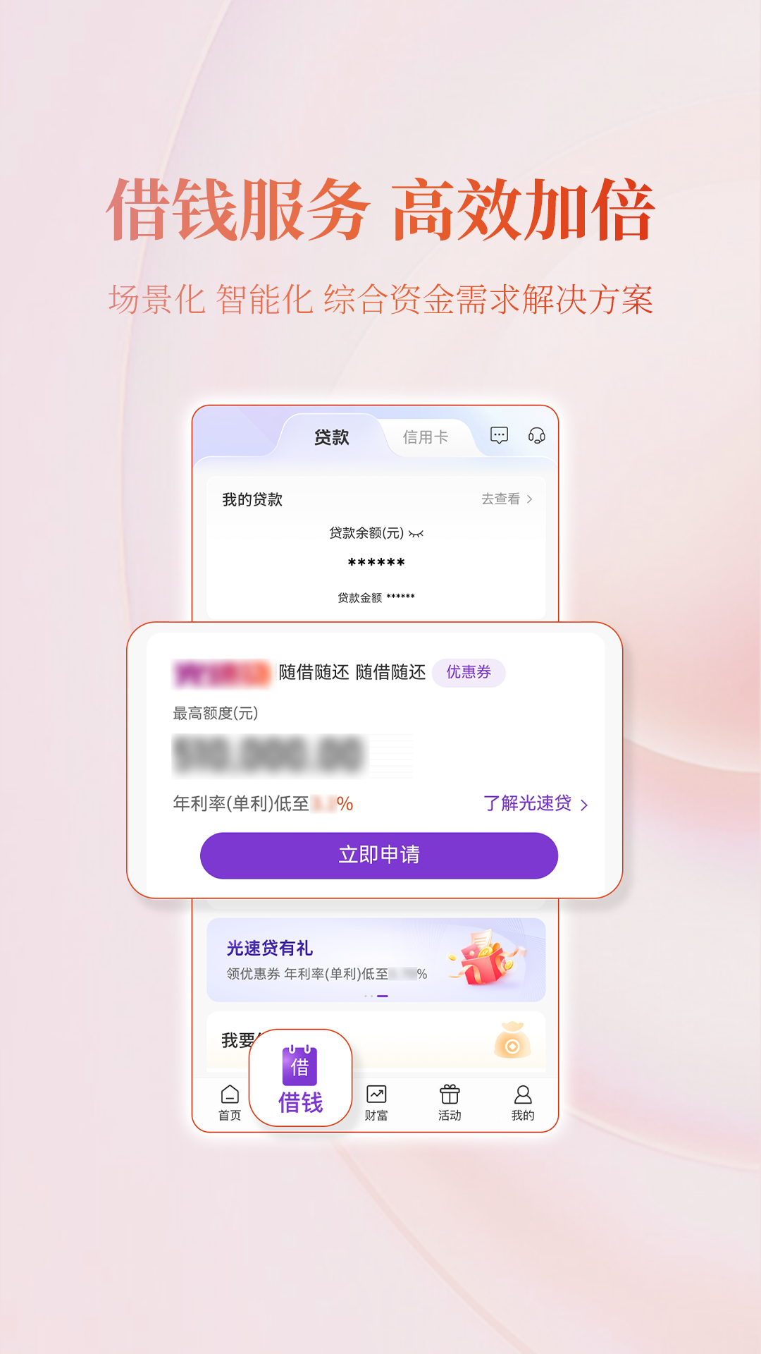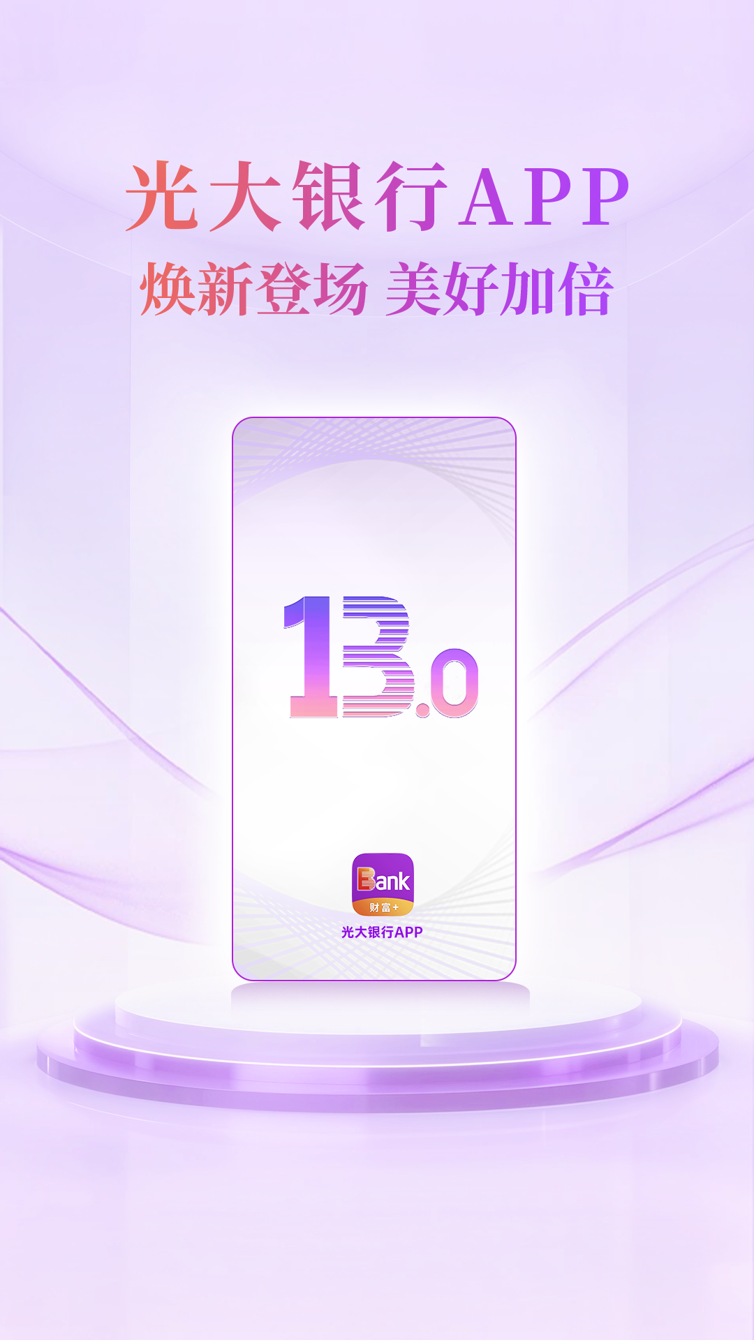光大手机银行13.0 焕新登场 美好加倍 一、首页布局 体验加倍 首页新升级,优化新体验,一目了然,一键直达。 1.财富精选个性化展示:精准匹配您的投资管理需求。 2.常用功能更便捷:将您常用的功能一键固定首页功能区,查看使用更方便。 3.乡村振兴助农直达:光大购精彩,爱心助农,为您提供价格优惠、产地直发的农特产品。 4.遇到问题怎么办:在线咨询服务、消费者权益保护,随时倾听您的声音。 二、阳光财富 专业加倍 阳光理财+阳光金选,信得过、更安心、更专业。 1.人生四笔钱规划更清晰:“活钱管理、稳健投资、进阶投资、保险保障”,助您实现财富旅程合理规划、有效管理。 2.理财定投更灵活:“目标投、人气投、安稳投”,开启财富管理新体验,一起攒个小目标。 3.人气榜单更贴心:“大家都在买”助您优选好品。 三、借钱服务 高效加倍 全新推出“借钱”频道,为您提供“贷款+信用卡”综合资金需求解决方案。 1.贷款页签:从资金使用场景出发,提供“我要经营、我有增信、我要买房、我要消费”四大产品专区。 2.信用卡页签:覆盖信用卡多项功能,查账还款、额度调整、积分兑换、热门活动一站式管理。 四、养老专区 关爱加倍 一体化综合养老解决方案。 1.养老专区:“社保、企业年金、个人养老金”三位一体综合养老金融服务。 2.颐享服务专区:提供“金融+医养康旅”光大特色服务,专属折扣价格。 3.简爱版改版升级:化繁为简,助力银发用户乐享便捷服务。 五、活动升级 精彩加倍 新界面、新玩法、新体验。 玩转大牌权益:美食、饮品、旅行、影音、购物,超多福利天天特价购、周周限时领。