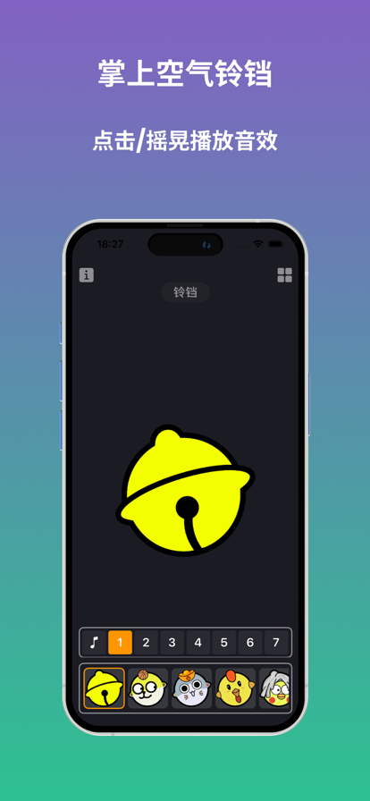 --- 空气铃铛 --- 【主要功能】 1. 点击/摇晃手机发声 2. 可单次,可连续自动播放 3. 统计各音效播放次数 【音效包含】 1. 基础音效:铃铛 2. 动物音效:鸡,狗,猫 3. 人物音效:鸡鲲,马老丝、昊京、蓝色妖姬、华强、杰哥、虎哥等鬼畜明星流行音效