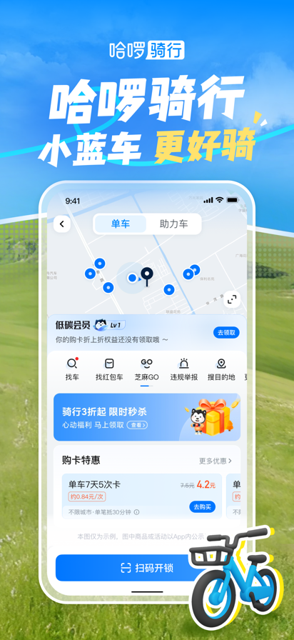 哈啰-陪伴生活每一天 骑车打车,约顺风车,租车自驾 【哈啰单车】 哈啰单车免押金,扫码用车极速开锁 购卡骑车更优惠 【哈啰助力车】 轻松骑行,一蹬就助力 【哈啰打车】 特价快车,立即出发,天天享折扣 出租车,更快接送,高峰时段打车不发愁 品牌联盟,一键呼叫多平台车型,体验更优 【哈啰顺风车】 临近出发时间订单被取消,补偿乘客优惠券,出行更安心! 支持乘客出行备注高速费支付意愿,线上化收支流程,高效更安全! 车主接单详情页全新升级,信息展示更清晰,接单更放心! 【哈啰租车】 芝麻信用,押金双免:芝麻分500分以上有机会免车辆押金及违章押金 上门取送,准时准点 极速下单,锁定车型,有车保障 免费取消,无忧出行 【哈啰送货】 送得快,省得多 汽车送货 跑腿拉货送东西 【哈啰加油】 哈啰优选站,天天享特价优惠,加油品质有保障 新人礼包:新用户享首单礼,最高满200元可减30元 【哈啰充电】 百万电桩,一个APP都搞定:已聚合小桔、星星、蔚来等多个品牌充电桩 天天特价,比价充电更实惠: 新用户首单享7折优惠,老用户可低价购买超值优惠券包 联系我们: 微信公众号:哈啰服务号 微博:@哈啰 客服电话:95175177 邮箱:service@hellobike.com