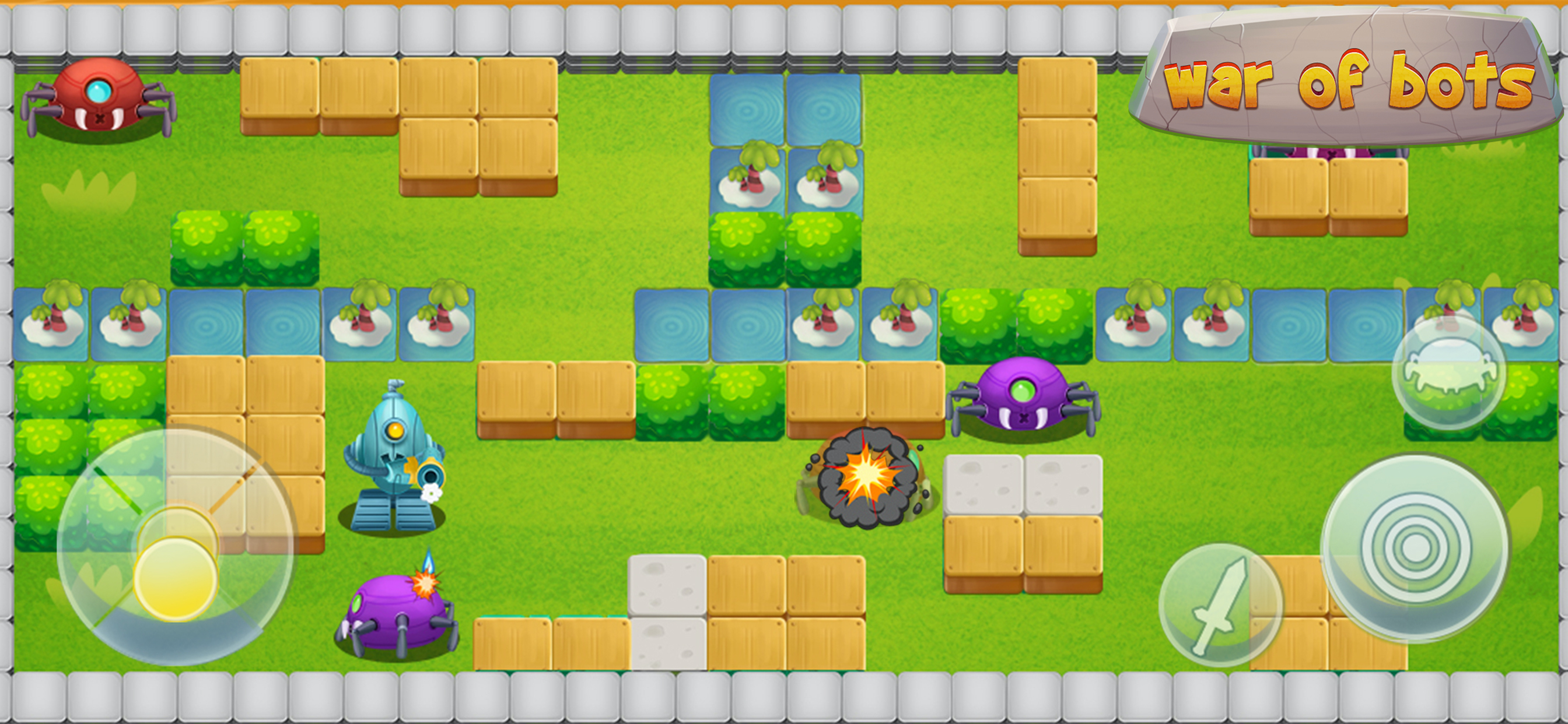 介绍:还记得小时候玩过的坦克大战吗?一定印象深刻吧! 没错!这就是经典红白机机器人大战的复刻版。在原版的基础上,我们略微调整了游戏风格、新增了更多的特殊奖励与关卡道具,同时在地图设计上也做出了一些创新。在游戏画面上,增加了爆炸射击的光影特效,给战斗场面带来了更炫酷的视觉冲击力。简单而有节奏的背景音乐与突出的效果音完美融合,渲染出一种紧张的战斗气氛。 感兴趣的你不妨一试,相信它会带你找回曾经的感觉。 游戏目标:每关需要在不同的地形上摧毁20个敌人机器人才能通关。不要只顾炮轰敌方机器人,注意保护好自己哦! 操作方法:点击屏幕左下角的方向键控制机器人移动,点击右下角的发射键发射子弹。
