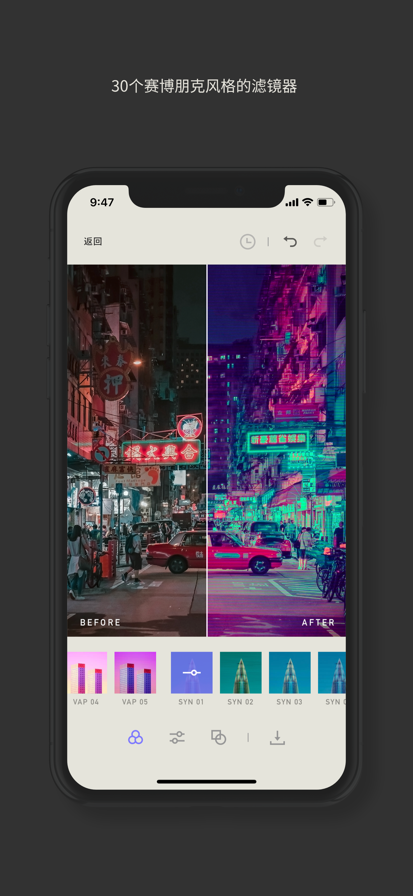 Neongraf受科幻,霓虹灯黑和赛博朋克的启发,可以帮助您通过照片或视频捕捉夜晚的美丽。 ● 滤镜预设 梦幻般的美学,动感的灯光和生动的调色板,是将照片和视频传输到高科技世界的基本元素。 Neongraf提供了30种出色的赛博朋克风格预设,这些预设适当地结合了这些元素。 ● 调节工具 您可以改变曝光,对比度,温度,色调和清晰度,增强阴影和高光,添加星光效果, 晕影和色差等等。 ● 图层效果 您可以通过组合提供的叠加层来创建自己的外观。 图层物包括散景灯,VHS故障和粒状纹理。