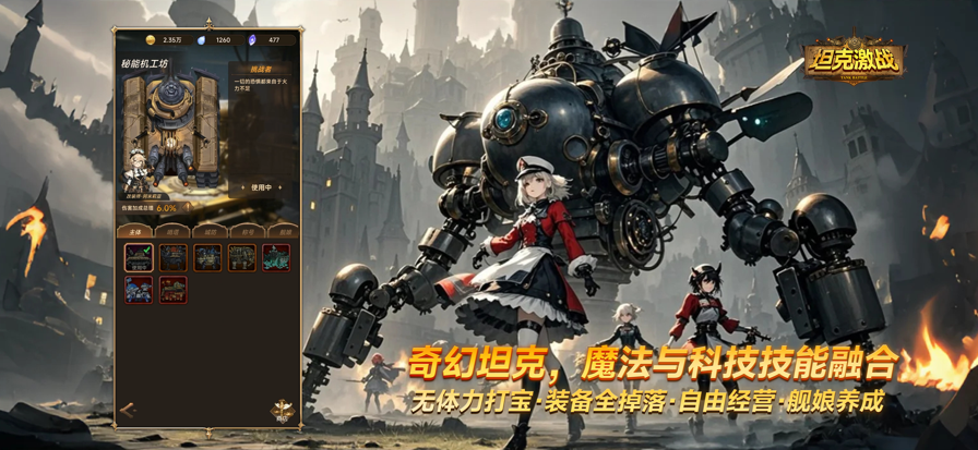 在这里你可以自由选择各种战甲、源石、哨塔和晶核……将它们组合成一个最适合自己的战斗流派(也称为“BD”),用它来进行挑战和打宝,赢取丰厚的战利品 【酷炫的蒸汽朋克机甲幻形】 “坦克激战”采用了全新的哨塔+机甲的战斗形式,以形态各异的机甲替代传统的职业设计。我们目前准备了17个造型各异且特性不同的哨塔以及5个特色机甲供大家使用。每种哨塔和机甲将有完全不同的战斗特性和运用场景,这将很大程度上决定你的战斗风格 【围绕机甲展开的战斗】 “坦克激战”的战斗并非反复使用多个技能打一轮循环输出的模式,而是强调对单一核心机甲的特性进行增幅,主要围绕没有冷却时间的机甲攻击来进行输出。游戏中的哨塔可以通过串联结合,实现技能效果和形态的改变,同时也能对机甲进行大幅度的强化。通过各类机制组合和探索,所有的提升项均能反馈到机甲上而不会浪费,且每个人都能自由定制出最适合自己的构建方案。 【海量词缀,自由构建BD】 我们为源石系统提供了56个孔位,玩家可以自由考虑使用哪些源石,而非跟随提前设定好的天赋走向进行加点,同时设计了40种特殊源石词缀,每一条特殊词缀均可以作为一个基石进行构建。同时还有6个晶核装备和4个星芒核心可以拥有多达数十条的词缀数量……就像将一颗种子浇灌为枝繁叶茂的巨树,大家通过一个线索将机甲特性、源石、哨塔以及晶核的选择结果进行穿针引线的联动组合,各类机制如同放大器一般将核心机甲进行全面增幅,一个独一无二的战斗流派就此诞生!相信没有谁会拒绝为了达成这样的BD一点一点去升级刷宝变强的过程。 【自由交易,无体力限制,无课程表】 本作希望带给大家高自由度的体验,除了在局内战斗系统上的设计外,在局外玩法系统上我们也遵循着自由的理念。比如游戏提供黑市功能,通过打宝获得的绝大部分战利品都可以在黑市中进行交易,帮助大家置换资源;且游戏没有体力限制,只要有空随时可以拿起手机打宝和琢磨BD;游戏没有课程表式的活动和任务,我们绝不会驱使大家对照着日程表上线“打工”;同时游戏内几乎所有的道具均能通过打宝刷图获得,且提供了多样化的休闲玩法在刷图之余用于放松心情 我们希望得到各位指挥官们的支持、陪伴和反馈建议。倾听大家的声音并及时作出回应意见是非常重要的一环,作为同样喜爱玩游戏的研发成员非常热衷于和大家多交流打成一片,欢迎大家也加入我们的社区将你的真实体验和反馈告诉我们。谢谢大家!
