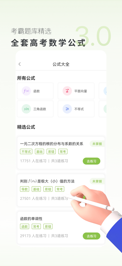 【权威高考数学精选题型】 高中数学必考类型:三角函数、立体几何、数列、推理、导数所有高考数学必考内容一网打尽,详细到你无法自拔。 【科学分类模块速效学习】 将易错本,笔记本,自学视频,自学音频四大模块科学分类,让你的思绪更加清晰,刷题更加事半功倍! 【有趣特色学习闯关模式】 特别开发的闯关模式会来检验你的学习效率究竟如何哟~尽全力督促你的学习,让你的效率一高再高! 【贴心听力单句精听回播】 再也不用将整段音频来来去去倒退快进,想听哪就听哪,全部都由你说了算!听力精听的神器! 【方便符合手机使用习惯】 充分考虑你在被窝里刷,在地铁上刷,在吃饭时刷的种种情境~合理设置了美美的界面让你时时刷题! 逆袭不是梦,考神祝你变学霸~ 考神君系列软件: 高中数学,助你一圆高考梦!