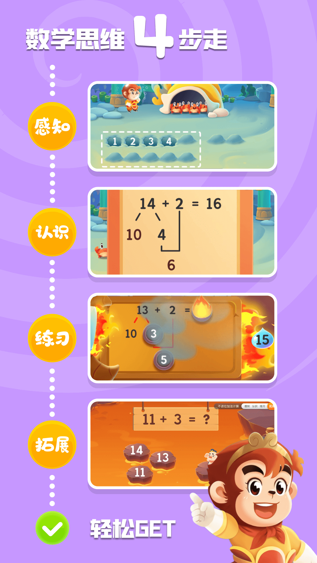 《悟空数学》是一款为儿童打造的数学思维逻辑启蒙应用,它依据儿童的认知心理特点进行设计,旨在激发孩子们的兴趣和潜能,在数与量、计算、空间与图形、逻辑推理、时间等核心领域中综合培养他们的逻辑思维。 【产品亮点】 古老的西游神话与现代数学相融合,引领孩子们踏上一场充满奇幻与智慧的数学探险之旅。 寓教于乐的方式,点燃孩子的好奇心和求知欲。通过语音交互引导,鼓励主动观察和发现,潜移默化地领悟思考方法,培养创造力和独立思考的能力。 根据儿童注意力特点,设计短时高效的学习模式,只需几分钟即可开始,充分利用零散时间,无需全程陪同。并通过感性认识,讲解分析,趣味练习,巩固拓展四个步骤,让孩子在愉快氛围中自主探索。 难度分级,循序渐进 下载《悟空数学》,让孩子们在西游世界的历险中,轻松掌握数学知识,开启智慧之旅吧! 客服电话:400-666-3016(9:00-17:30) 在线客服:关注微信公众号“悟空识字”,点击在线客服