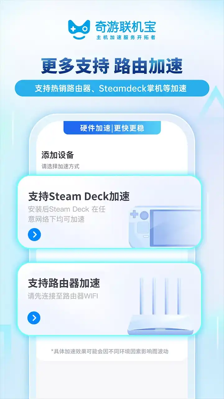 奇游联机宝(主机加速),为主机而生。 支持Switch/SteamDeck/PS5/PS4/Xbox/Oculus Quest 2等上千款主机游戏下载联机加速。暗黑破坏神4、宝可梦朱/紫、喷射战士3、集合啦!动物森友会、怪物猎人:崛起、战地、APEX英雄、使命召唤系列、FIFA系列等,一键加速智能分配节点,游戏不等待! 【支持手机加速】 支持手机热点或者WI-FI加速Switch,随时随地开启Switch游戏下载联机新体验! 【支持Steam Deck插件加速】 快捷安装,无需繁琐硬件,畅游Steam Deck联机游戏世界! 【支持路由器插件加速】 手机连接家庭WIFI,自动识别并安装路由器插件,一键开启全主机平台加速,告别主机游戏下载慢、联机不流畅的糟糕体验! 【奇游联机宝加速盒】 主机加速盒,即插即用,告别繁琐操作,一键优化NAT类型,主机硬核玩家优选!游戏库识别主机类型自动显示,加速智能匹配区服,轻松开启主机硬核畅玩时代! 【联系我们】 官方 QQ 群:725871940 官方公众号:联机宝