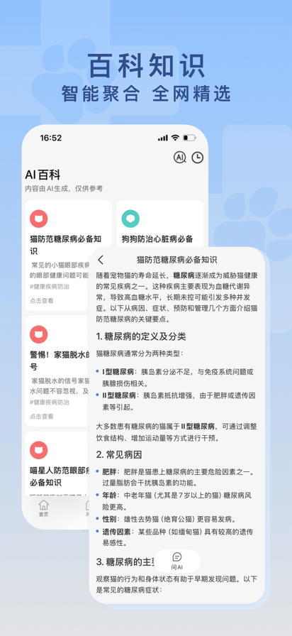 爱宠医生是一款面向宠物主打造的智能诊断与健康管理平台,接入多个主流AI大模型,融合智能问诊、图像识别、报告解读等强大工具,为宠物提供专业、高效、便捷的健康服务。 无论是突发的健康问题,还是日常的养护疑问,您都可以通过AI智能问诊快速获取诊断建议,平台可自动识别宠物症状、分析可能病因,并生成详尽的诊断报告。上传宠物图片即可启动图像识别,辅助判断皮肤病、外伤等常见问题。 注意:本应用提供的信息由AI生成,仅供参考,不能替代专业医疗建议、诊断或治疗。在做出任何治疗决策前,请务必咨询专业宠物医生。 平台内置AI百科知识库,覆盖犬猫等主流宠物常见疾病、疫苗接种、营养饮食、行为训练等多方面内容,让您在日常养宠中也能轻松获取专业知识,科学养宠更安心。 同时,宠物健康档案系统支持全生命周期管理,包含疫苗记录、体检记录、问诊记录等信息,历史数据将自动参与诊断分析,让AI真正“了解”您的宠物,为每一次判断提供全面参考。 爱宠医生不仅是一款工具,更是一位24小时在线的智能健康顾问,让您随时随地掌握爱宠健康状态,从容应对每一次护理与决策。