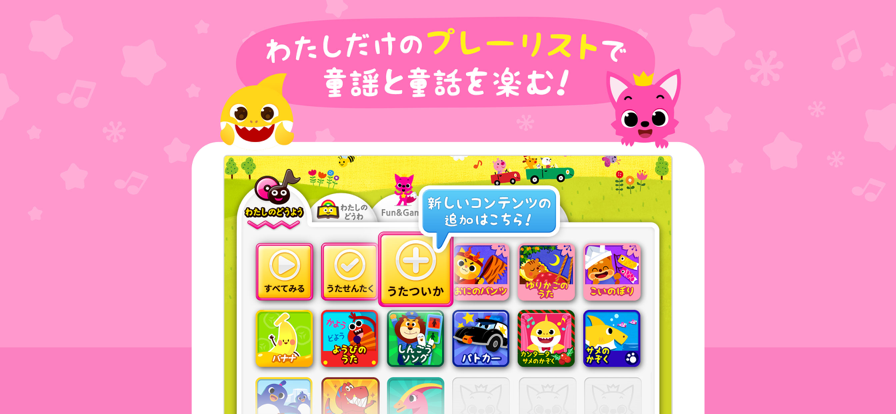 「PINKFONG!知育アニメ絵本」は1~7才の子供の為の童謡と童話を映像で楽しめるアプリです。 お家やレストラン、スーパー、車などでの外出時、いつでもどこでも親子で一緒に面白い童謡と童話を楽しむ事が出来ます。 ■特徴■ 1.親子で童謡・童話を一緒に楽しめるアプリです。 2.童謡200曲、童話60編以上を収録!どれもアニメーションとなっていて本が苦手な子供でも気楽に楽しむことが出来ます。 3.童謡は人気童謡はもちろん、英語童謡、フォニックス童謡、マザーグースも収録しています。 4.クリスマスソング、ハロウィンソングなどのシーズン曲も楽しめます。 5.子供たちが真似できるようにかわいいキャラクターが振り付けを教えてくれる童謡もあります。 6.童話はイソップ童話、世界名作英語童話、自動車や飛行機など乗り物を主人公にした創作童話シリーズを収録しています。 7.映像には子供の感性や創造性を育てるような手描き絵や色づけを使いました。 8.どの映像には童謡歌詞とストーリの字幕があります。 9.購入した曲や童話はiPhoneとiPad両方で使えます。「購入確認」メニューボタンで復元を行ってください。 10.ダウンロード済みのコンテンツは「すべてみる」ボタンで反復再生が出来ます。 ■童謡10曲、童話10編を無料で楽しめます! ■さらにアプリを使い始めてから3日間は毎日コンテンツがプレゼントされます! この以外にも多くの童謡と童話を購入して楽しむ事が出来ます。 新しく面白い童謡と童話もこれから追加していきますので楽しみにしてください。 ++++++++++ アプリの不具合やご意見などはこちらまでお問い合わせください。 cs@smartstudy.co.kr