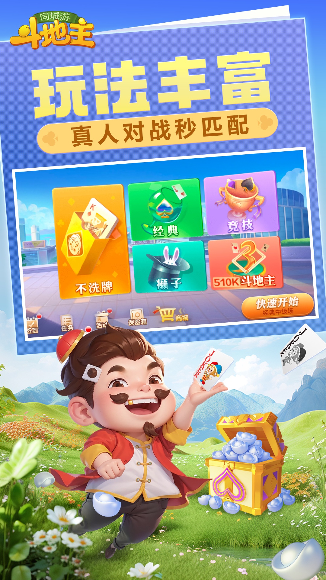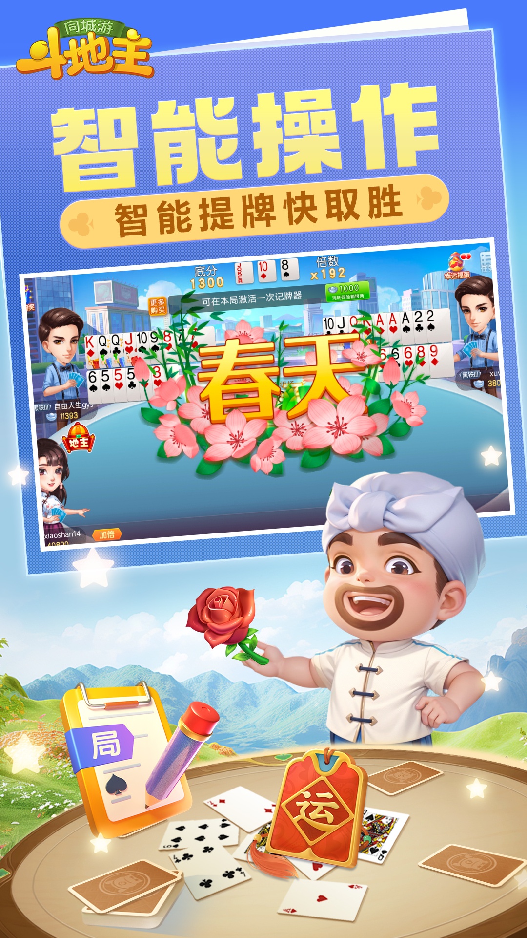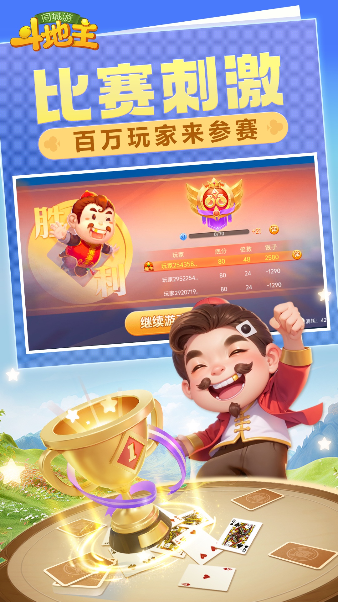 全民欢喜斗地主平台! 单机斗地主、癞子斗地主、传统三人斗地主,斗地主竞技场玩法任你选;画质精美,单机斗地主、联网斗地主随你挑。炸弹满手抓,起手打春天;还有残局,癞子玩法,竞技场等你来战 同城游斗地主游戏特色: 【玩法经典,画面精美】 同城游斗地主集经典斗地主、癞子斗地主、扑克棋牌竞技、单机斗地主等玩法于一身,多种全民斗地主玩法,任你挑选;同城游斗地主画面清爽,玩起来更带感,更刺激! 【奖励不断,嗨玩全场】 斗地主对局越多,奖励越多,宝箱升级,嗨玩全场! 【万人在线,一秒开局】 数万真人斗地主玩家同时在线,全民斗地主!秒速配桌,斗地主更迅速,升级更刺激! 【竞技赛场,挑战升级】 斗地主玩家之间进行比赛,积分排名越靠前,游戏奖励越丰厚。天天斗地主,欢乐升级! 【高手在线,快速开局】 众多高手同时在线,快速配桌,更迅速,更刺激!