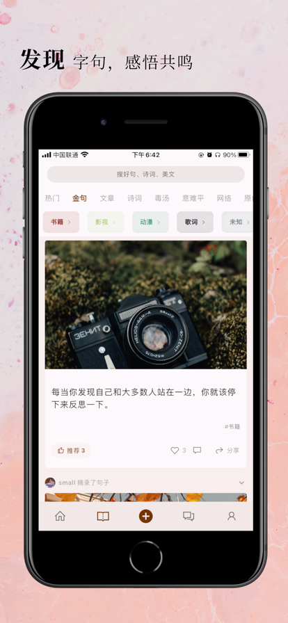 每天给自己10分钟,感悟一句话,欣赏一篇美文,远离短视频,拯救你的文艺退化症,在日常的焦躁中沉淀自己,用一杯茶的时间找回丢失已久的温暖和宁静。 这里是一个有温度的文字轻社区,关于文字,关于你的思考和内心共鸣。 在「句摘」,你可以: · 用漂亮简单的模板记录句子,轻松记录灵感 · 发现和收藏共鸣的句子,让灵感涌现 · 阅读古诗词,提升文学修养 · 阅读名家散文,增长阅历 · 成为优质内容创作者或读者,分享阅读心得 · 分享琐碎日常,与他人互动 · 记录私密日记,释放内心 · 分享触动内心的句子给好友,互相鼓励 · 早安、晚安问候语陪伴孤独的灵魂,温暖相伴 · 碗毒鸡汤清醒思想,避免盲目追求 · 随意更换国宝系主题色,自由展现个性。 句摘,一个温暖的句子社区。