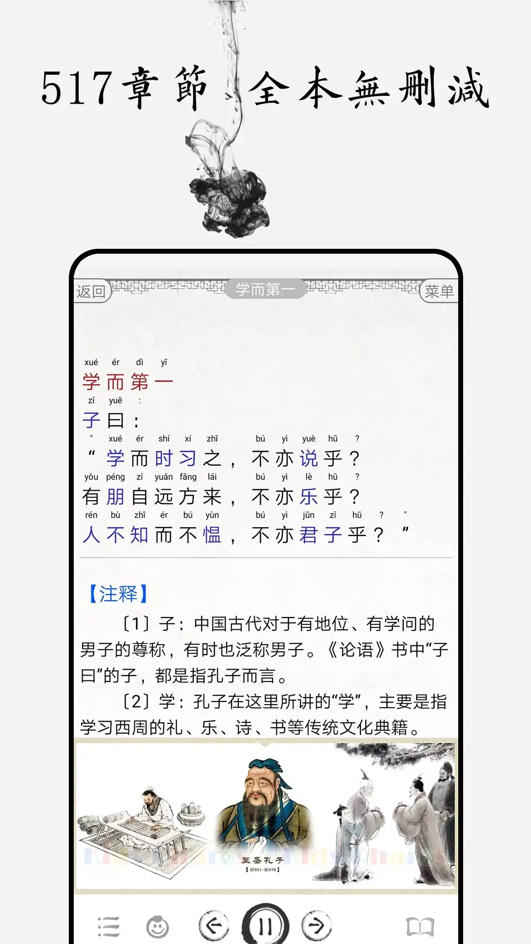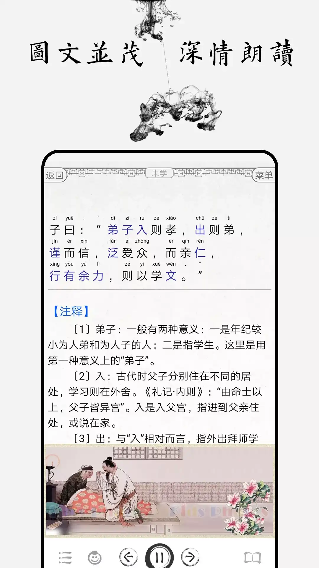 《论语图文有声》国学软件是由爱好国学的团队所制作,其内容以弘扬中国传统文化、表达儒家思想、体现古人智慧魅力为主,老师深情的朗诵、准确的拼音、完整的注释、甜美的译文、易懂的启示、有趣的故事、水墨风插画、还有实用/易用的学习功能...使其声情并茂从而提升用户的阅读兴趣。 该软件包含《论语》全本内容,涵盖每个章节的详细解析,为你讲解流芳千古的儒家经典,轻松领悟其智慧内函。 领略国学魅力,弘扬传统文化,团队成员衷心希望国学智慧能得到家长、老师、学生的共同发扬和分享! 目录: 1学而第一 2为政第二 3八佾第三 4里仁第四 5公冶长第五 6雍也第六 7述而第七 8泰伯第八 9子罕第九 10乡党第十 11先进第十一 12颜渊第十二 13子路第十三 14宪问第十四 15卫灵公第十五 16季氏第十六 17阳货第十七 18卫子第十八 19子张第十九 20尧曰第二十 ● 软件功能特点: 1、用心校对,纯净无广告,软件可在常见版本的安卓系统和安卓设备运行。 2、图文并茂,插图和正文大意匹配,方便学习与理解。 3、拼音可隐藏,排版合理,中国风界面赏心悦目。 4、正文由“白云”老师朗读,部分启蒙国学可选儿童朗读,译文也有语音,对儿童早教有帮助。 5、软件支持简/繁体切换,支持顺序/循环/手动播放/后台播放,支持开/关背景音乐,支持打开/隐藏拼音。 6、每个章节内容均可收藏,用户可方便找到自己喜欢的国学内容。 ● 软件使用需知: 1、用户向软件付费后,软件会自动绑定指定的帐号并解锁,用户可通过帐号共享功能,给另外三台同系统的常见设备长期使用,一个帐号不支持无限解锁新设备。 ---- 介绍完毕 ----