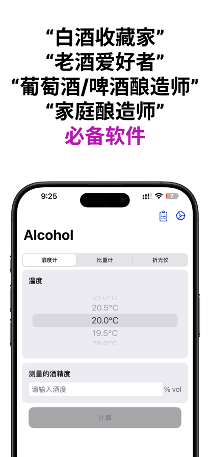 【简介】 无论你是酿酒爱好者、实验室工作者,还是烈酒调配师,酒精度计算器都能为你提供精准、专业的计算支持。 核心算法基于国家标准 GB/T 10345 (白酒分析方法) 建模,告别繁琐的查表和估算误差,这款离线可用的工具助你瞬时完成专业校正。 【核心功能】 • 专业温补校正(20°C基准) 根据当前环境温度,精准还原白酒、酒精溶液的真实度数,消除读数偏差。 • ABV/Proof 稀释计算 想勾兑到指定度数?输入当前酒度和体积,秒出需水量,助力精准调配。 • 质量与体积换算 支持将体积(L)转换为质量(kg/斤)及反向换算,酿酒物料核算更轻松。 • 复古老酒鉴定助手 针对老酒、收藏酒的“跑酒”情况进行专业度数与容量推算。 • 全离线运行 无广告、无需网络,在实验室、酒窖或生产车间随时随地使用。 【适用人群】 • 家庭自酿爱好者及职业酿酒师 • 老酒收藏、收酒从业者与鉴定师 • 教学、科研及生物化学实验人员 • 酒厂生产、勾兑与质检人员 严谨 · 精确 · 极简 · 无广告 立即下载,开启您的专业数字化酿造体验!