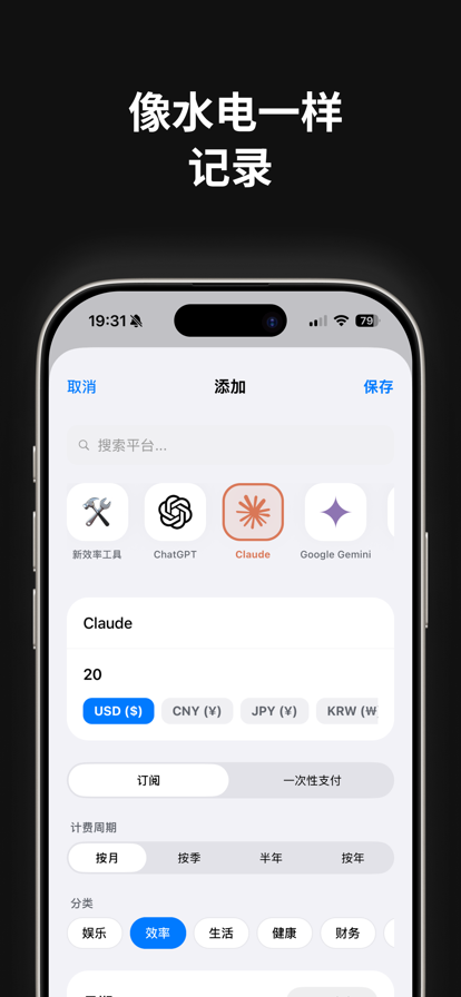 在这个万物皆订阅的时代,我们的银行卡就像漏水的龙头。iCloud、各种视频、音乐、软件会员……这些定期的支出构成了我们数字生活的“水电费”。 Meter 是一个极简、纯粹的支出仪表盘。我们不仅记录数字,更记录你的“数字生存成本”。 【核心功能】 - 仪表盘概览:首页以精美的卡片流展示所有服务,自动提取品牌色,直观呈现下一次扣款日与金额。 - 多维统计系统: - 趋势分析:你的“电子水电费”是在上涨还是下降? - 结构透视:订阅制与买断制的比例是多少? - 分类占比:娱乐、生产力、工具,钱都流向了哪里? - 灵活的计费模型: - 完美支持 订阅制 (年/月/季/周) 与 买断制。 - 内置主流服务图标库,支持自定义。 - 纯净体验: - 无广告,无后台,无账户体系。 - 数据完全存储于本地,隐私绝对安全。 【关于价格】 Meter 自身拒绝成为你的一笔“订阅开销”。 一杯速溶咖啡的价格,获得永久的使用权。