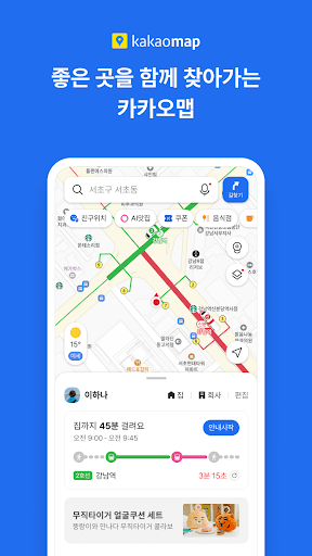 Kakao Map,韩国最快的路线指南!<br><br>从最快的路线搜索到美味餐厅、附近推荐等等,<br><br>体验您期望的一切导航功能!<br><br>◼︎ 需要快速导航时!<br><br>✔ 最快最精准的地图<br><br>无论您是驾车、乘坐公共交通、步行还是骑行,我们都会为您提供24小时内更新的最新信息。<br><br>✔ 即时导航<br><br>找到路线后,即可在 Kakao Map 中直接获取导航,无需额外安装。<br><br>✔ 集成搜索,无需菜单导航<br><br>只需一个搜索栏,即可一次性找到您需要的所有信息,包括公交线路、站点和位置。<br><br>◼ 需要附近信息时!<br><br>✔ 为您推荐<br><br>根据您当前的位置,我们会推荐实用信息,例如美味餐厅、搜索词、景点和节日活动。<br><br>✔ 在地图上搜索区域<br><br>使用“重新搜索此区域”功能,即可在地图上立即查看搜索结果!<br><br>✔ 基于数据的地点信息<br><br>我们分析大量访客数据,按年龄、性别和星期几提供地点信息!<br><br>◼ 当您需要更专业的指导时!<br><br>✔ 分组管理您的收藏<br><br>分组管理您的收藏,在地图上显示它们,甚至可以同时分享和订阅群组! ✔ 预览路线图<br><br>找到路线后,您可以使用路线图预览地点,然后再前往。<br><br>✔ 逼真的 3D 地图<br><br>这款基于矢量的地图提供 360° 旋转和倾斜的 3D 视图,带来更真实的地图体验。<br><br>✔ 逼真的 3D 天空视图:鸟瞰视角<br><br>使用逼真的 3D 天空视图进行 3D 地图搜索。<br><br>◼ 以及所有您需要的额外功能,助您轻松找到方向:<br><br>✔ 地图上直接显示收藏夹<br><br>✔ 实时公交信息,减少等待时间<br><br>✔ 实时路况信息,查看拥堵路段<br><br>✔ 地铁线路图,方便您乘坐地铁<br><br>✔︎ 好友位置:想知道您的 KakaoTalk 好友的当前位置吗?<br><br>✔︎ 釜山、春川、木浦、蔚山、济州和光州的高精度公交定位信息服务<br><br>◼ 使用 Watch 专属应用,体验更便捷<br><br>✔ 在 Wear OS 设备上体验 Kakao Map!直接在手表上获取公交和地铁到站信息、公共交通上下车提醒以及自行车路线信息。<br><br>Kakao Map 与您一同成长,期待您的反馈。<br><br>✔ 咨询中心<br><br>- maps@kakaocorp.com<br><br>- Kakao 客服中心网站 (http://www.kakao.com/requests?locale=ko&service=59)<br><br>- 客服中心:1577-3321<br><br>- 开发者联系方式:1577-3754<br><br>----<br>◼︎ 服务访问权限指南<br><br>[可选访问权限]<br><br>- 位置:当前位置、附近搜索<br><br>- 麦克风:语音搜索<br><br>- 存储(照片和视频):照片上传<br><br>- 电话:导航<br><br>- 相机:拍照<br><br>- 在其他应用之上显示:路线小部件<br><br>- 通知:上下车提醒、自行车导航、Kakao 地图活动和推荐信息<br><br>- 访问附近设备:Kakao i<br><br>- 活动:与选定用户共享您的实时位置所需权限。<br><br>* 即使您不同意可选访问权限,您仍然可以使用此服务。 * 如果您使用的 Android 版本低于 6.0,则无法单独授予权限。因此,<br><br>我们建议您联系设备制造商,了解他们是否提供系统升级功能,<br><br>并尽可能升级到 6.0 或更高版本。<br><br>---- 开发者联系方式:<br><br>1577-3754