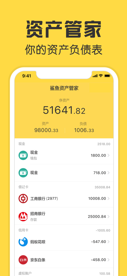 【产品简介】 鲨鱼资产管家是一款专业的资产记账软件 银行卡、信用卡太多,很难管理? 股票、基金、余额宝,投资分散,很难汇总? 房贷、车贷等多种负债,很难统计? 鲨鱼资产管家帮你一站式管理多种资产负债 极简操作让你轻松掌握资产变动状况 并用图表帮你多维度盘点分析资产 为了保障信息安全,无需输入任何银行账户信息,只需手动更新余额 【产品功能】 一站式管理:多种资产在此一处管理,方便又安全 快速添加:操作简单,轻松上手,快速添加资产 变动清晰:轻松查看余额变更记录,掌握资产变动状况 图表分析:资产,负债,净资产分类统计,用饼图、折线图、柱状图等,多维度帮你实时盘点资产状况,了解资产构成 数据安全:登录账号后,记录的数据实时同步在云端,数据安全更有保障