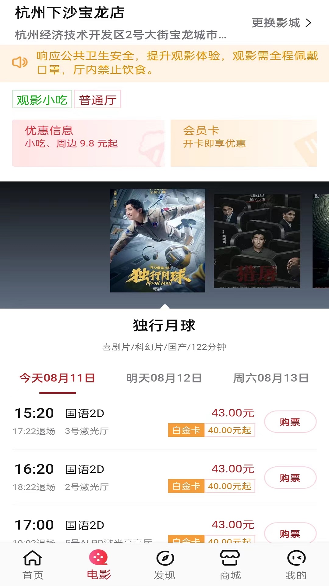 丝滑抢票上猫眼,优惠活动享不停!<br>【演出抢票超轻松】热门明星艺人演唱会、音乐节、电竞体育赛事、脱口秀、话剧音乐剧、休闲展览等演出订票so easy,信息精准推送不迷路~<br>【影讯更新快又全】电影购票、选座超便捷,最新影视资讯统统有,票房口碑一眼知,还有明星见面会福利哟~<br>【吃喝玩乐一站通】周边休闲玩乐美食团购全都有,热门景点、密室逃脱、美食、KTV等嗨不停。<br>意见建议联系我们:<br>官方新浪微博:@猫眼电影 @猫眼演出<br>官方微信:电影演出票 猫眼电影 猫眼电影演出玩乐 猫眼演出票 猫眼演出<br>官方网站:http://www.maoyan.com/<br>全国客服热线:1010-5335