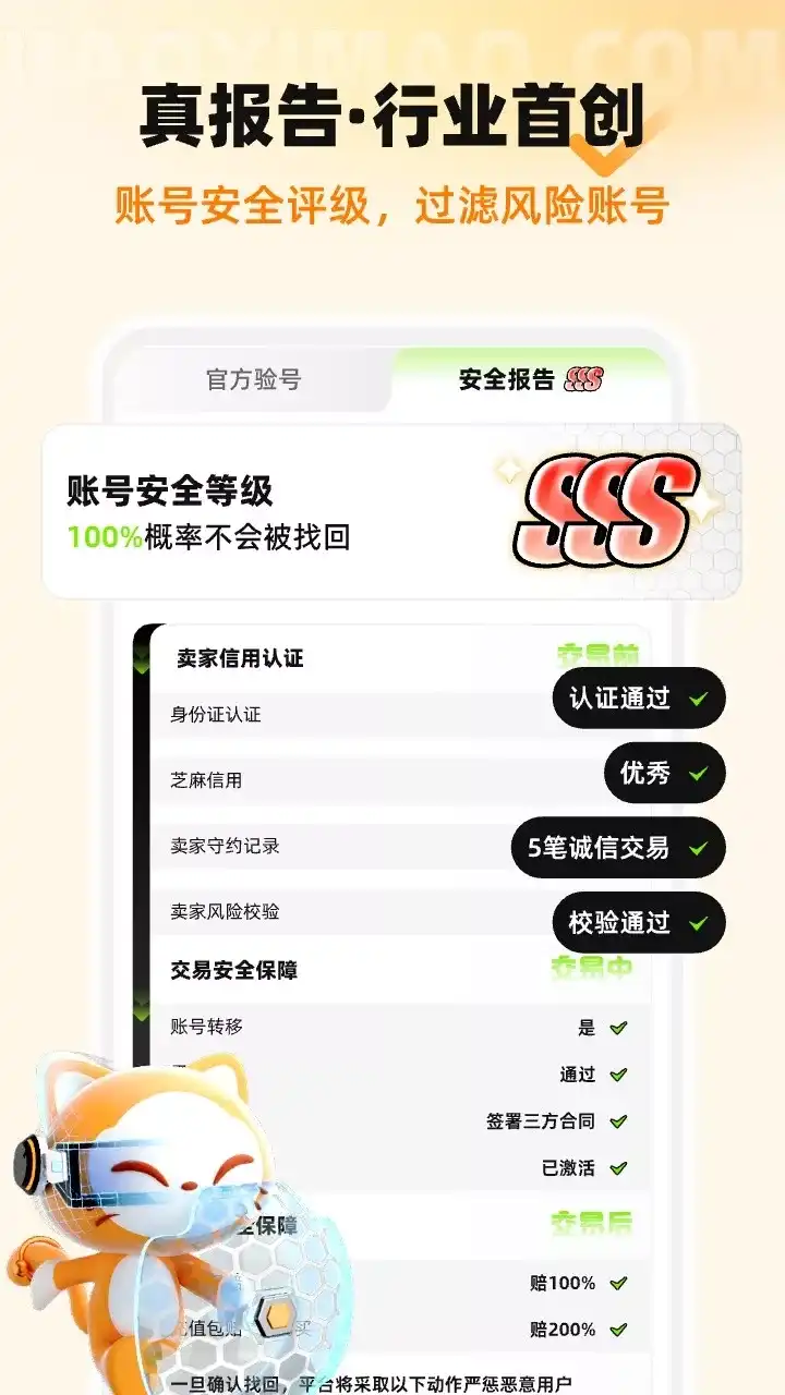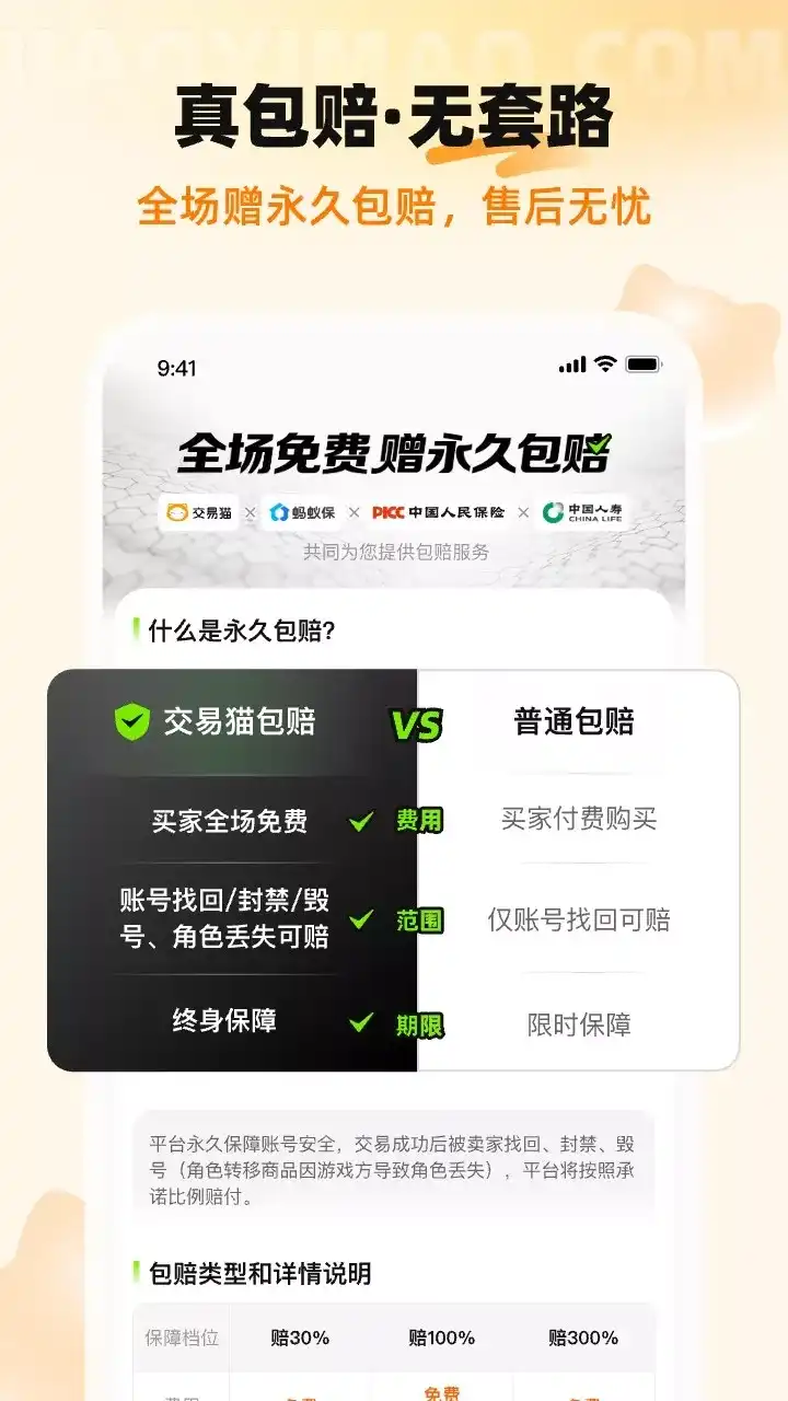 阿里巴巴灵犀互娱旗下专业的游戏三方交易平台交易猫,涵盖手游,端游,steam等全品类游戏交易APP,为热爱游戏的你提供,帐号交易,帐号回收,代练等一系列游戏交易服务;同时提供角色转移,永久包赔,保险服务,实人认证等多重安全保障;游戏交易就上交易猫,1亿玩家选择的游戏三方交易平台。 产品特色: 【安全交易】角色帐号转移服务,安全无找回 【安心购号】账号交易可选永久包赔,售后无忧产品介绍 【买号】 三国志战略版,晶核,王者荣耀,原神,逆水寒,三国杀,崩坏:星穹铁道,明日方舟,斗罗大陆,崩坏,梦幻西游等8000+款游戏,毕业脱坑帐号低价捡漏。 【卖号】闲置游戏帐号一键上架,脱坑帐号极速变现,千万游戏玩家帐号交易选择。 【游戏币】魔兽世界,地下城与勇士,少年三国志2,创造与魔法,三国志幻想大陆等游戏币,超实惠交易就上交易猫。 【道具】和平精英,王者荣耀,新笑傲江湖,闪烁之光,神雕侠侣2,球球大作战等热门游戏道具折扣秒杀。 【代练】QQ飞车,火影忍者手游,王者荣耀赛季上分,日常代肝,游戏上分先人一步,fgo,阴阳师日常奖励全搬空;大神直播代练,高效安全。 【礼包】独家礼包,想玩就玩不用肝,SSR抽不停
