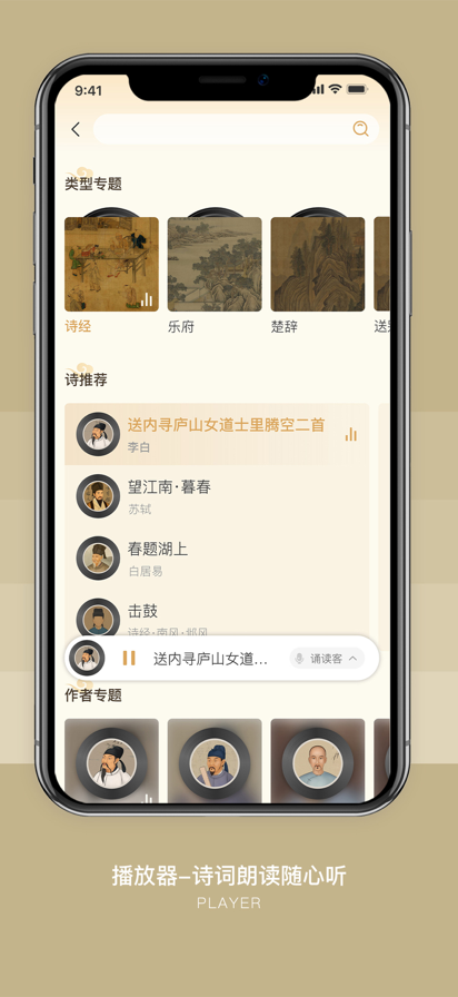 软件特色: 1、精选了从诗经到当代诗歌中最经典的诗词名篇上千首 2、专业主持人倾情诵读 3、语音和诗词完全同步 4、所有文字和语音全离线数据,无需网络支持。 5、所有诗词内容全部精编排版。 享受诗词吧! ------------------------ 古诗词包含以下栏目 唐诗三百首 宋词三百首 古诗词 诗经 楚辞 汉乐府 魏晋南北朝 唐诗词 宋诗词 元曲 明清诗词 纳兰词 当代诗词 -------------------------------- 《唐诗三百首》是一部流传很广的唐诗选集。《唐诗三百首》共选入唐代诗人77位,计310首诗,其中五言古诗33首,乐府46首,七言古诗28首,七言律诗50首,五言绝句29首,七言绝句51首,诸诗配有注释和评点。 五言古诗简称五古有,是唐代诗坛较为流行的体裁。唐人五古笔力豪纵,气象万千,直接用于叙事、抒情、议论、写景,使其功能得到了空前的发挥,其代表作家李白、杜甫、王维、孟浩然、韦应物等。 七言古诗简称七古,起源于战国时期,甚至更早。 古诗词:诗词是中文独有的一种文体,有特殊的格式及韵律。诗按音律分,可分为古体诗和近体诗两类。古体诗和近体诗是唐代形成的概念,是从诗的音律角度来划分的。 按内容可分为叙事诗、抒情诗、送别诗、边塞诗、山水田园诗、怀古诗(咏史诗)、悼亡诗,咏物诗,军旅诗等。古体诗有《诗经》《楚辞》《乐府》《汉赋》《南北朝民歌》等。近体诗一般是绝句,律诗,排律(长律)。