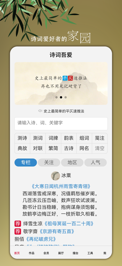 千古诵诗词是一款专业的古诗词学习赏析应用,内有唐诗、宋词、文言文、古籍、诗友圈、诗词朗诵、飞花令等诗词学习工具,不仅能够帮助广大学者和诗词爱好者秒懂古诗词之含义,掌握诗词学习之要领,还能从多方面解析古诗词所蕴含的深意,理解诗人创作时的心境,达到理解记忆目的的同时,更能深刻感受古诗词传统文化博大精深的魅力! 主要功能: 【诗词文库】百万诗词文库,按朝代、作者、作品等分类,包含注释、译文及赏析,发现中华五千年文明。 【诗词分类】精选分类包括:主题、选集、词牌、写景、名山、节气、时令、时间、节日、花卉、地理、城市、用典、课本等。 【诗词搜索】按朝代搜索:先秦、两汉、三国、晋代、南北朝、隋、唐、五代、宋、辽、金、元、明、清等。按作者搜索:李白、杜甫、李清照、王维、白居易、辛弃疾、孟浩然、杜牧、苏轼、屈原、李商隐、陆游、李煜、陶渊明、柳永、温庭筠等。 【诗词选集】唐诗三百首、古诗三百首、文言文翻译、宋词三百首、元曲三百首、诗经、乐府、论语、红楼梦、三国演义、水浒传、西游记等。 【高效学习】可生成专属学习计划,学而有术,掌握高效的学习方法,图文并茂有声朗读的学习诗词和复习诗词 【诗词游戏】诗词飞花令和诗词接龙等诗词游戏,让想学习富有趣味性和竞技性。 【跟读背诵】名家朗诵,加深诗词理解和记忆。 【名句赏析】经典名句,感受古人用词之精辟。 【国风主题】诗情画意,领略古诗文意境之美。 【详尽解析】逐字逐句,注释翻译通俗且易懂。 隐私政策: http://gushi.zld666.cn/privacyPolicy?package_name=com.zld.gushici.qgs&platform=ios&channel=AppStore 用户协议: http://gushi.zld666.cn/userAgreement?package_name=com.zld.gushici.qgs&platform=ios&channel=AppStore 会员服务协议:http://gushi.zld666.cn/vipServiceProtocol?package_name=com.zld.gushici.qgs&platform=ios&channel=AppStore