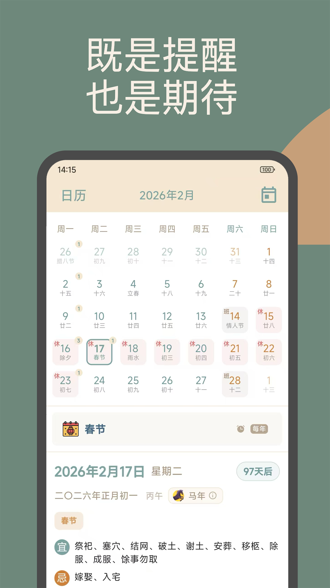学生党记不住考试日期?上班族漏了项目截止日?想给家人过农历生日却总忘?时间印记以「双历核心+精准倒计日」为基底,搭配多端提醒与云端同步,适配学生备考、上班族日程、家庭纪念日管理,是跨人群的实用日历工具。<br><br>一、核心双历+倒计日,覆盖高频需求<br>双历无缝切换:公历为主界面,同步显示农历,支持1900-2100年精准转换。学生查寒暑假农历日期、长辈记传统节庆、普通人标农历生日,无需额外换算,一键搞定;<br>全场景时间追踪:学生可设高考、四六级倒计时,桌面小组件实时显剩余天数;上班族标项目截止日,提前3-7天自动预警;还能记恋爱周年、旅行计划,正计时留住美好;<br>智能重复提醒:农历生日、每周课程、每月发薪日等可设置重复规则,无需反复操作。<br><br>二、多端提醒+云端同步,数据不遗漏<br>四重提醒保障:系统通知+桌面小组件+日历同步,形成闭环。在设定的提醒时间点可收到系统消息推送提醒,同时系统日历也会同步提醒,确保提醒及时,多渠道触达用户;<br>多端加密同步:手机、平板、电脑数据实时更新,换设备时记录自动恢复,复习计划、会议纪要、纪念日安排永不丢失。<br><br>三、完备日历基础,满足日常刚需<br>节假日调休清晰:内置法定节假日数据,春节、国庆等假期标注明确,调休补班日特别高亮,规划出行、工作不踩坑;<br>灵活日历视图:支持日/周/月/年历切换,搭配待办清单,学生用周历排课、列复习待办,上班族用月历标项目节点,家庭用户用年历记重要日子;<br>轻量附加工具:含日期计算器、黄历、星座、生肖等趣味功能,无需切换多 APP。<br><br>四、清爽体验+好口碑,好用无负担<br>无广告极简设计:进入直显“核心倒计日+双历”,3步完成新增,学生、长辈都能快速上手。<br>4.8 分用户认证:学生说 “备考靠它记倒计时,widget 一目了然”;上班族反馈 “双历+同步实用,换手机不丢待办”;家庭用户称赞 “农历生日提醒精准,没再忘给爸妈送祝福”。<br><br>从学生备考、上班族日程,到家庭纪念日、全人群节假日查询 —— 时间印记以 “双历+倒计日+纪念日” 为核心,用提醒与同步做保障,是日历工具的优选。立即下载时间印记,让每段重要日子都精准掌控!