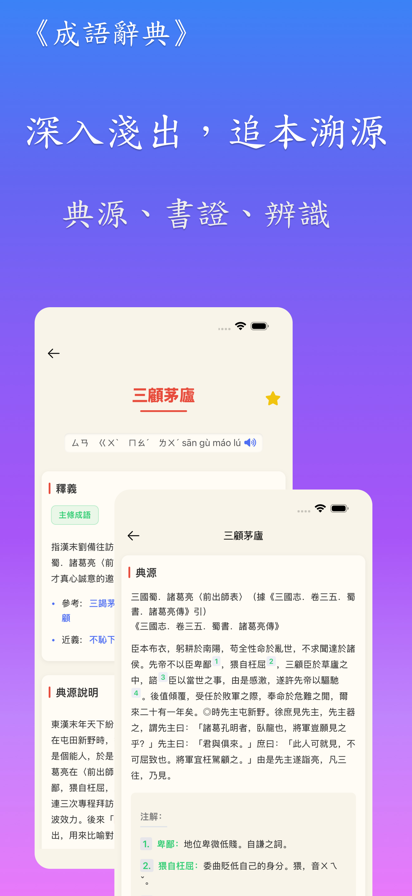 《成語辭典》內容源自教育部《成語典》,聚焦成語的「釋義+由來+用法+語境」,兼顧深度與易讀性,幫助系統化學習與靈活運用。解鎖進階內容包,完整呈現成語典故、出處、語法、書證與例句。 核心特色 典源出處 • 成語出處、典故原文與譯解 • 歷史脈絡與引申義 用法精析 • 釋義分層、語色與語體 • 常見誤用與易混成語辨析 • 近反義詞對照 • 歷代典籍書證 高階檢索 • 依主題、首字/尾字、字數、結構、關鍵詞檢索 • 支援注音、拼音與漢字查詢 學習工具 • 例句豐富與情境運用 • 收藏夾與查詢歷史 • 全面離線支援 適用族群與場景 • 教學備課、閱讀理解、作文造句 • 競賽準備與寫作素材蒐集 • 自主進階學習 華典中文出品