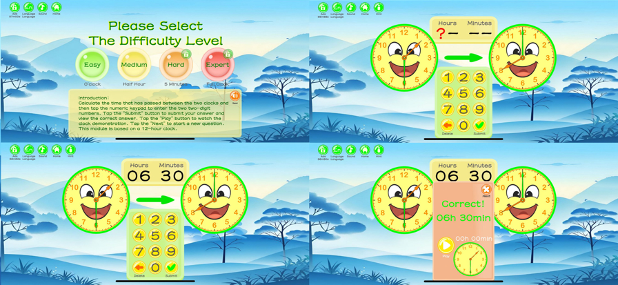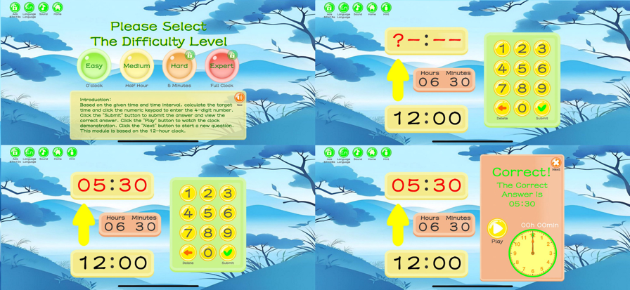 这是一款帮助孩子了解时钟和时间的软件。 通过可爱的界面,交互的方式进行时间题目练习。 1 通过拨动时针和分针观察时间变化。 2 通过钟表指示练习写出时间。 3 通过数字显示练习画出表针。 4 写出前或后相隔一段时间的目标时间。 5 写出两个钟表显示之间经过的时间。 每一个模块都有文字和语音说明。 每一题都会给出正确答案,方便检查。 部分题目会给出钟表的动画演示。