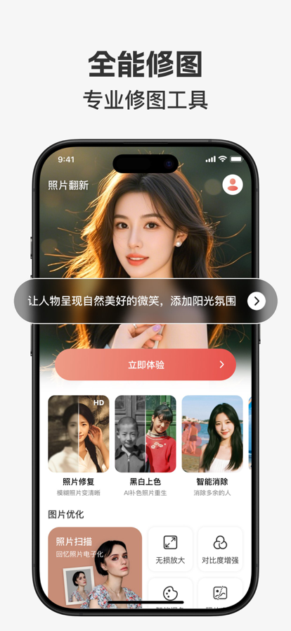 照片翻新 APP,让照片绽放新光彩 你是否曾为老照片的折痕、模糊而叹息?是否渴望为黑白照片添上鲜活色彩?又或者想将平凡照片变成艺术佳作?这款照片翻新 APP,满足你的作图需求! 强大功能,满足多元需求: -精修照片,雕琢每处细节 运用先进 AI 算法,精准优化照片画质,提升色彩饱和度、对比度,锐化边缘,让照片质感飞升。无论是风景照、人像照,都能细腻呈现,展现独特魅力。 -拯救废片,变腐朽为神奇 模糊不清、曝光过度、色彩失真…… 这些都不是问题!APP 智能识别并修复照片瑕疵,还原清晰画面,让那些被遗忘的废片重获新生,成为珍贵回忆的完美记录。 -画质增强,高清视觉盛宴 突破分辨率限制,无损放大照片,自动填充细节,使画面更加清晰、细腻。从低像素老照片到网络下载的模糊图片,都能一键升级为高清大片,带来震撼视觉体验。 -折痕照片修复,抚平岁月痕迹 独特算法精准定位折痕,智能填补缺失像素,去除褶皱,让老照片重现平整光洁。仿佛时光倒流,将岁月留下的痕迹悄然抹去,唤醒尘封记忆。 -擦除路人,聚焦精彩瞬间 只需轻松涂抹,即可快速擦除照片中闯入的路人或多余物体,智能填充背景,保持画面自然流畅。从此,照片只留存你想要的主角与美好,构图更完美。 -照片上色,点亮黑白世界 为黑白老照片注入鲜活色彩,基于海量数据训练的 AI 模型,能根据场景、人物精准匹配色彩,还原真实生动的色彩场景,让历史瞬间跃然眼前,鲜活起来。 -图片变漫画,开启创意之旅 多种漫画风格任你选择,一键将照片转换为个性漫画,无论是 Q 萌可爱风,还是炫酷热血风,都能轻松实现,为你的照片增添别样艺术气息,满足创意表达。 -一句话改图,所想即所得 强大的自然语言处理技术,只需输入你的修改需求,如 “把天空换成蓝天白云”“给人物添加微笑”,我们便能理解并精准执行,轻松实现照片随心改,创作无边界。 快来下载照片翻新 APP,开启照片翻新之旅,让每一张照片都成为值得珍藏的艺术品,记录生活的精彩瞬间! ------------------------------- 订阅说明以及条款 【订阅价格】 1、 周会员-¥18 2、月会员-¥38 3、年会员-¥88 隐私政策:http://static.rhinox.cn/html/privacy/10165189133779517290.html?appName=照片翻新 付费协议:https://static.rhinox.cn/html/paymentagreement/general.html