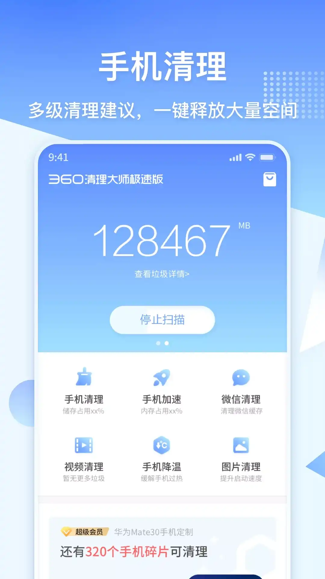 360清理大师:更简单,更畅快! 6亿用户信赖的手机清理神器! 360清理大师是一款完全免费的手机加速与空间清理软件,强力加速使手机运行更流畅,一键清理快速解决空间不足问题。 【一键清理】一键搞定无用垃圾,手机清理更省心 【手机加速】瞬间释放手机内存,加速效果超同行 【微信清理】深度清理微信垃圾,微信聊天更流畅 【短信清理】智能短信分类,广告推送轻松删 【相册清理】自动筛选不美照片,留住精彩瞬间 【手机瘦身】全面分析存储空间,垃圾无所遁形 注:360清理大师适用于使用标准android4.0.3及以上系统的所有手机 【联系我们】 官方QQ群: 372851919 官方微信:360清理大师 官方微博:http://weibo.com/360yhds 官方论坛:http://bbs.360safe.com/forum-2463-1.html