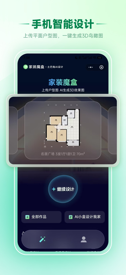 家装魔盒,土巴兔旗下的AI装修设计APP,降低装修门槛,0基础也可以上手。从一张平面户型图到高清3D效果图,AI助您瞬间预见未来之家,轻松规划理想装修方案。 【AI秒速生成,告别漫长等待】 只需上传一张户型图,强大的图像识别技术瞬间构建3D空间。输入你的想法,AI算法45秒内自动完成平面布局与设计,并生成逼真的3D效果图!无需漫长沟通,灵感立等可取。 【随心所欲,在线自由换装】 对设计方案不满意?一键即可重新布局空间结构!地板、墙面、橱柜、沙发...海量装修材质与软装单品任你搭配。轻点屏幕,就能实时看到不同风格、不同材质的装修效果,轻松找到你的最爱的装修效果图。 【预见未来,装修决策不后悔】 在动工前,就能720°全方位体验在未来的家中。直观感受空间布局、光线效果和家具搭配,有效避免装修遗憾。让设计从“奢侈品”变为每个装修家庭的“标准前置步骤”。 【0门槛操作,人人都是设计师】 无需任何专业设计基础!简洁明了的操作界面,引导你一步步完成梦想家的创作。无论是现代简约,还是北欧风情,你的审美就是最好的设计语言。
