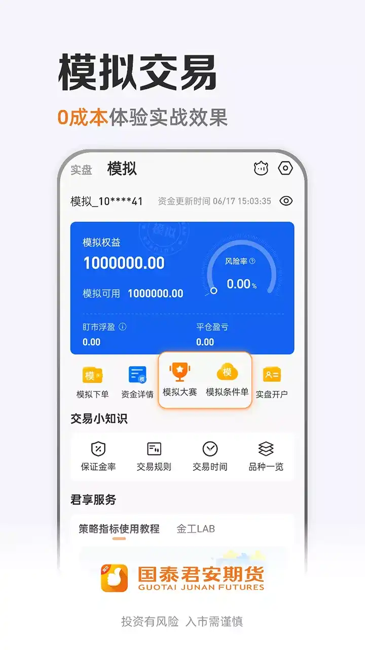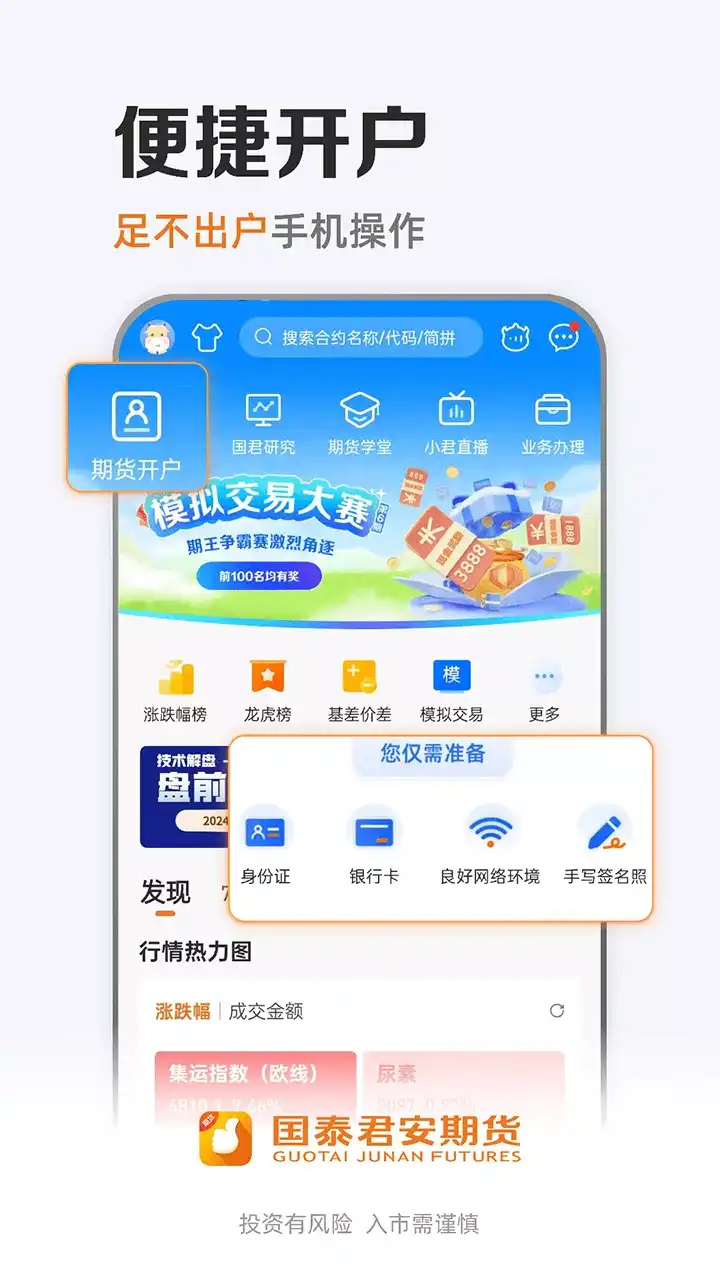 【产品简介】 「更准」研究团队深度分析,市场板块专业解读。 「更稳」交易通道流畅稳定,止盈止损尽在掌握。 「更快」行业动态实时更新,每日看点精彩不断。 「更全」足不出户在线开户,业务办理全面便捷。 【特色功能】 国君研究——顶尖投研团队为您提供及时专业的投研报告,覆盖全行业全品种,还有丰富的直播和活动,与分析师大佬面对面互动交流。 市场数据——每日期货品种涨跌幅、各品种资金流向、季节性对比、基差价差图表、各经纪商持仓龙虎榜等海量数据等您来发掘。 期货行情——国内所有交易所的期货、期权、指数等实时行情;国际各大交易所行情数据;支持自选行情、多类指标图、分类查询等便捷功能。 期货交易——与国内所有交易所光速互联,拥有智能条件单、画线下单、闪电下单等特色。 业务办理——从极速开户到银期绑定,从修改密码到账户激活,从特殊品种权限申请到仿真开户,一站式流程让您足不出户,享受服务。 行业动态——7×24小时实时新闻让您随时掌握国内外市场动态;汇集交易所、专业媒体、综合媒体等各渠道的海量资讯让您全面了解行业发展。 国泰君安期货为投资者提供原油、贵金属、有色金属、能源化工、农产品、期权、股指期货、黄