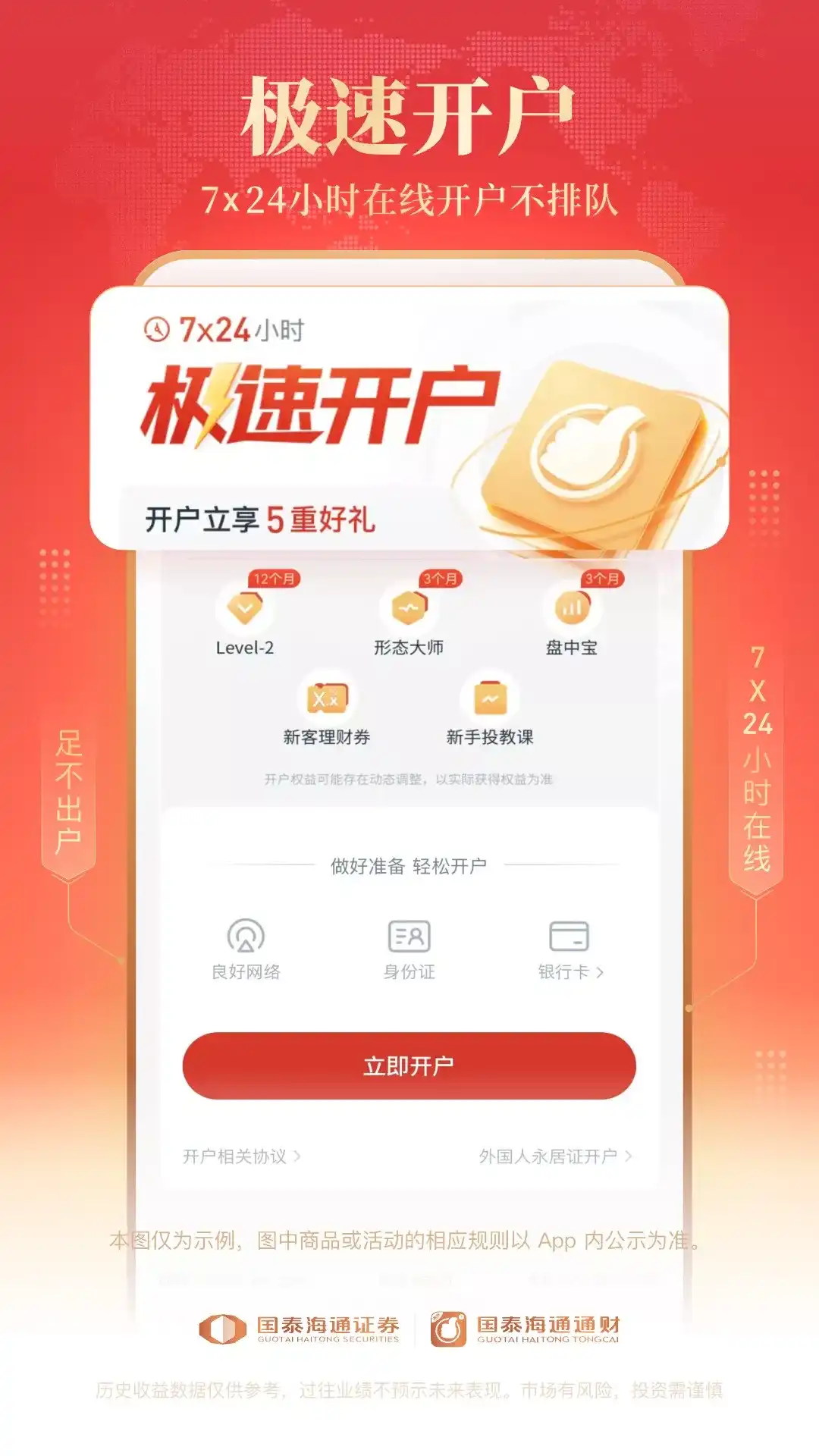 【国泰海通通财】7*24小时开户,权益多多,持续为投资者提供专业的金融服务。 炒股,理财,基金,一站式综合财富管理服务! 更短的时间,更快的决策,就在国泰海通通财! --------------智能矩阵-------------- 【智能盯盘】 股价预警、大事提醒,更有7大策略盯盘; 捕捉下单好时机,只为更轻松地投资 【智能账户】 盈亏一目了然,每日交易复盘; 6大维度洞察投资能力,工具课程匹配提升; 【智能客服】 7*24小时温馨守候,全天候响应专业服务体验; 【智能选股】 基本面、技术面、舆情、大数据选股,多维考察更专业; 【智能资讯】 个性化推荐热点资讯,您关心的才有价值; 【一键打新】 轻松一键自动打新,中签提醒不错过; -------------主打服务--------------- 【多市场品类交易】 支持A股、期权、OTC、场外基金等交易 【全品种秒动行情】 沪深港及全球行情秒速更新,畅享Level2十档行情; 股票、债券、基金、期货、外汇市场动态一网打尽 【精品理财产品商城】 严选公募、理财产品等,多样选择助力财富管理 【市场资讯全球热点】 24小时全球资讯滚动,第一时间把握市场脉搏; 海通研究所独家深度解读,为您的投资保驾护航 【随时刷脸开户】 7×24小时,单向视频验证不排队,一步到位绑定银行卡 【全业务办理掌厅】 支持48项4大类业务涵盖所有需求,快速办理无需等待 【联系方式】 在APP使用过程中,您有任何建议或遇到任何问题,都可以联系我们: 1、打开国泰海通通财,点击“客服” 2、拨打服务热线“95521” 温馨提示:理财有风险,投资需谨慎。请根据个人风险承受能力,理性投资。 新客好礼: 新客户通过国泰海通通财APP开立证券账户,可获得行情月卡12个月、盘中宝3个月、形态大师3个月、新手投资训练营、新客理财券一张。开户成功后,卡券将发放到通财APP上,限有效期内使用,活动即日起长期有效,具体内容以APP内所示为准。