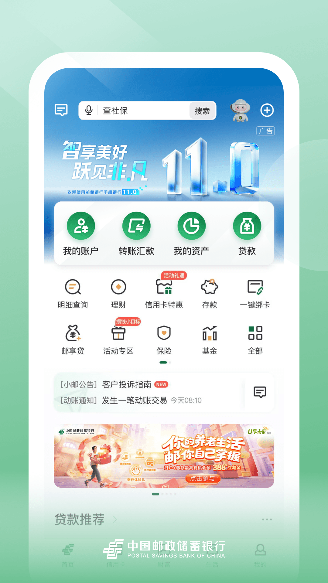 管钱、借钱、省钱,一部手机尽享金融服务。 #为每个人提供便捷的资金管理服务# · 全品类资产及收益数据展示更新,15年内账户明细随时可查,年/月/日多周期报告提供分析。 · 养老、住房、跨境、乡村、社保、亲子、代发等多种客群和功能专区,为不同客户打造专属服务。 · 自主研发风控大脑毫秒级风险决策,个性化简易化安全认证方式,严格安全保障和简洁使用体验两不误。 #为每个人提供丰富的财富信贷方案# ·“新手宝典”“四笔钱”“建行严选”“财富会员”“财富百宝箱”,为您提供多种类型的财富产品方案。 ·“龙钱宝”“嗖嗖攒”“轻松还”,多种创新服务满足活钱投资、边花边攒、还款管理等多样场景需求。 · 快贷、建信福贷、小微快贷、农户贷款、多种贷款产品实现线上测额、选品,一站式满足不同借钱需求。 #为每个人提供精彩的便民生活场景# · 电影购票、影视会员、智慧就餐等丰富生活场景,无论是否持有建行卡均可体验使用。 · 话、电、燃、水等民生缴费,社保、医保、公积金等便民服务,轻轻松松一站式管理。 · 任务中心开宝箱月月抽好礼,联合会员多重礼遇优惠,权益中心等级礼遇一键解锁、龙积分、优惠券好礼即用。