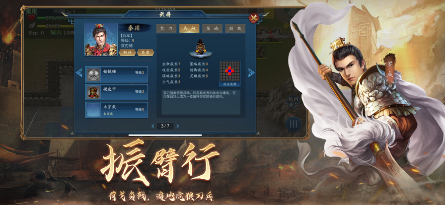 超大型复古策略战棋游戏,超大地图,三国14州150+郡国,300+关卡,100+武将!经典的战棋玩法,排兵布阵,站位,兵种搭配,地形,天气,士气,天时地利人和才能赢的战争!军团战,城战PVP,多元社交,场面宏大,剧情完整,还原三国古战役! 大汉末年,天下大乱,群雄并起,有韬略如孔曹司马,有勇武如吕赵典关,假如三国有奇迹,你在汉末扮演一代雄才,用自己的方式赢的每场战役,征伐各方诸侯,最终一统三国,成就霸业。 【游戏背景设定】 汉灵帝中平元年(184年)黄巾起义爆发,从此开始了近一百年的战乱时代:黄巾之乱——董卓乱政——群雄割据——三足鼎力——三家归晋。 【游戏玩法设定】 SRPG类型,开放式沙盒玩法,可自由选择当前任意战役关卡挑战。 大地图战场PVE重现经典历史;独特的城战PVP玩法,玩家们攻城掠地争夺资源,通过军团系统交流。 【近百武将】 每个武将技能不同,作战地形,天气状况,兵种之间搭配,走位,品质,战力,智力,装备等级都会影响到战斗的胜负。 曹魏: 八虎骑:夏侯惇•夏侯渊•曹仁•曹纯•曹休•曹真•夏侯尚•曹洪。 五子良将:张辽•乐进•于禁•张郃•徐晃。 五大谋士:郭嘉、荀彧、荀攸(谋主)、贾诩、程昱。 蜀汉: 五虎上将:关羽•张飞•马超•黄忠•赵云。 文臣谋士:诸葛亮•庞统•法正•简雍•麋竺•孙乾•伊籍•秦宓。 东吴: 四大都督:周瑜•鲁肃•吕蒙•陆逊 十二虎臣:程普•黄盖•韩当•蒋钦•周泰•陈武•董袭•甘宁•凌统•徐盛•潘璋•丁奉。 【兵种介绍】 1 英雄 均衡发展的万能型部队,能统领大军。在攻击和策略两方面都相当活跃。 2 重骑 身披重甲的骑兵部队,攻击防御都很优异,但是移动力较低。对步兵类的防御力很强,但是对长枪兵的抵抗较弱。 3 弓兵 使用弓箭杀敌的远程部队。能攻击较远的敌人,对骑兵类有一定优势。 4 弓骑 移动力和骑兵相似的远距攻击部队。对付轻骑兵类时,具有值得夸耀的强大攻击力。 5 武术家 爆发力出色的部队,也可以施展策略。对长枪兵有较大的伤害,但是惧怕远程的攻击。 6 贼兵 啸聚山林的强盗,攻击力强大、士气高昂的部队。在山地、荒地可以发挥真正本领。对敌时致命一击可期。 7 枪兵 装备长枪作战的部队。对骑兵类有较大伤害,但对武术家抵抗较弱。 8 兽骑 来自蛮荒森林的兽骑,野性十足。 9 策士 施展攻击类策略的文官部队。较能掌握奇术之人,能够施展强大的多种策略。对付精神力低下的敌人,威力更大。 10 巾帼 “须髯辈,巾帼情,人间羞杀丈夫称。”飒爽英姿,巾帼不让须眉。 11 步兵 防御力优异的步兵,擅长对付弓弩兵,但是惧怕骑兵类部队的攻击。在城池中有着突出的表现。 12 轻骑 移动力与攻击力优异的部队。对步兵类的防御力很强。但是对弓箭和长枪兵的抵抗力较弱。 13 海盗 海上抢劫的强盗,可在水上地形发挥强大战力的部队,也学会一些策略。 14 医师 负责军队粮草供应、医疗救护的文官。擅长施展各种恢复类策略,是作战时不可缺少的后方支援部队。 15 西凉骑 来自西北边陲的勇猛骑兵。攻击力出众、士气高昂的部队。非常善于在山岳、荒地中作战。缺点是策略防御力不足。 16 道士 施展妨碍类策略的文官部队。可运用诡异的策略削减敌人的战力。 17 投石车 射程无与伦比的远距攻击部队。用心锻炼的话,将来会有相当强的战力。 18 女兵 女性兵种。具有辅助战场部队的能力。 19 白马骑 由北方诸侯公孙瓒组建的骑兵,由于全部骑乘白马,故称“白马义从”,擅长雪地、山林作战。 20 都督 上识天文,下晓地理,坐镇一方;非文武双全者不能担当。 21 驯虎师 率领虎兵团作战的驯兽部队,拥有强大的攻击力和爆发力,一次可以攻击2个部队,对策略的抵抗较低。 22 驯象师 率领象兵团作战的驯兽部队,强大的气势有几率能使人陷入混乱,与其作战要千万小心。 23 驯蛇师 率领蛇兵团作战的驯兽部队,强大的攻击力和爆发力能使敌人瞬间瘫痪,强大的地形优势也是其最大的特点。 24 军师 君主的左膀右臂。可运用神出鬼没的策略,逼使敌人的精神状态陷入窘境。 25 百姓 毫无战斗力的百姓。 26 骑马策士 施展攻击类策略的文官部队,以移动力与骑兵类相同而自豪。 27 井阑 城攻、防设施,拥有很广的攻击范围,但是不具备近身攻击和移动的能力,且不惧怕法术的伤害。 28 虎豹骑 曹操最精锐的部队,天下知名,战绩赫赫。《三国志·魏书》说:“纯所督虎豹骑,皆天下骁锐,或从百人将补之。” 29 西凉铁骑 西凉马超的精锐部下。自古凉州精骑便横行天下,作战彪悍、凶狠,悍不畏死。曹操曾言“马儿不死,吾无葬地也”。 30 飞熊军 董卓的精锐部队,旗帜上绣有肋生双翅的飞熊图案,由西凉军中的精英和能人异士组成, 31 白马义从 瓒常与善射之士数十人,皆乘白马,以为左右翼,常高喊:“义之所至,生死相随!苍天可鉴,白马为证!”故号“白马义从”。 32 大戟士 袁绍帐下精锐部队,每人配备大戟和重甲,乃百里挑一的猛士! 33 鲲 远古神兽鲲的后裔,潜藏在大洋之下,“北冥有鱼,其名为鲲,鲲之大,不知其几千里也。” 34 黄巾力士 黄巾军中力大无穷的精锐战士,直接听命于张角,据说拥有神力,在战场刀枪不入。 35 并州狼骑 由汉朝最精锐的骑兵组成,前身是汉武帝时期组建的虎贲羽林,身经百战,战绩彪柄,速度迅猛,机动力极强。 36 仙术师 腾云驾雾,飞升成仙。 37 上将 三国上将,战力无双