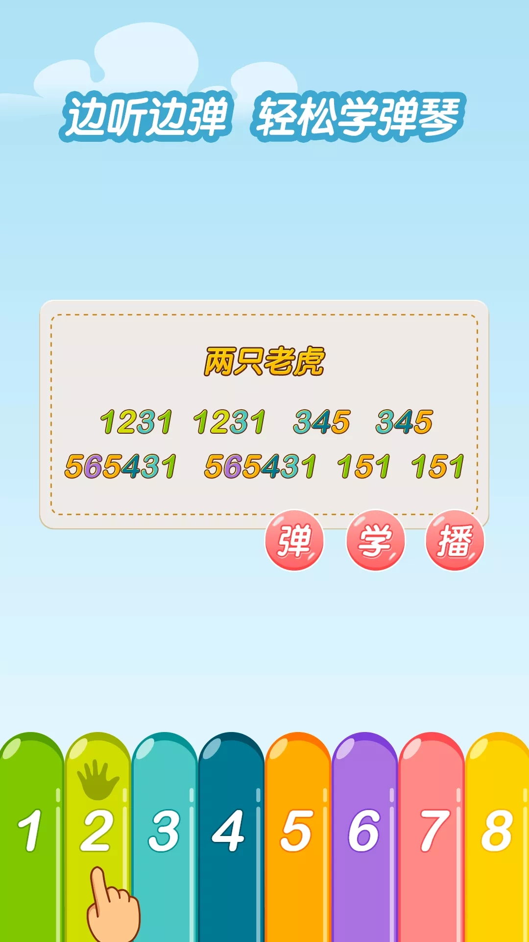 亲亲熊系列幼儿启蒙学习产品,专注亲子益智启蒙教育,开启宝宝对世界的正确认知! 【亲亲熊学弹琴】让宝宝轻松学习演奏儿歌音乐 精美的画面,动听的钢琴声音,美妙的音乐节奏,易学的儿歌简谱,让宝宝爱上弹琴,小手动起来,变身音乐家! ● 标准琴键,精准发音 用数字1-8对应8个常用音符,根据标准琴音进行配音,方便弹奏。 ● 精选音乐,经典儿歌 小毛驴、数鸭子、捉泥鳅、茉莉花、找朋友、哈巴狗、小兔子乖乖、铃儿响叮当、上学歌、七子之歌、小星星、两只老虎、粉刷匠等多首宝宝耳熟能详的儿歌童谣,跟着弹出的节奏唱起来 ● 七彩简谱 分小节演奏 熟练掌握1-8个阿拉伯数字,跟着小节提示进行演奏,变身小小音乐家。 ● 边听边弹 轻松学弹琴 亲亲熊独有的“学”“弹”“播”功能,可以让宝宝根据提示进行弹奏,通过播放功能收听完整的旋律,还能增强宝宝对乐感和声音的辨别能力哦! 【亲亲熊学弹琴】结合数字琴键与数字排列的乐谱,让宝宝亲手创造出好听的儿歌旋律,在弹奏的同时既能强化对数字的记忆,也能培养音乐乐感、节奏感,增强声音记忆能力,非常适合宝宝的早教启蒙,让宝宝快乐学习,快乐成长!