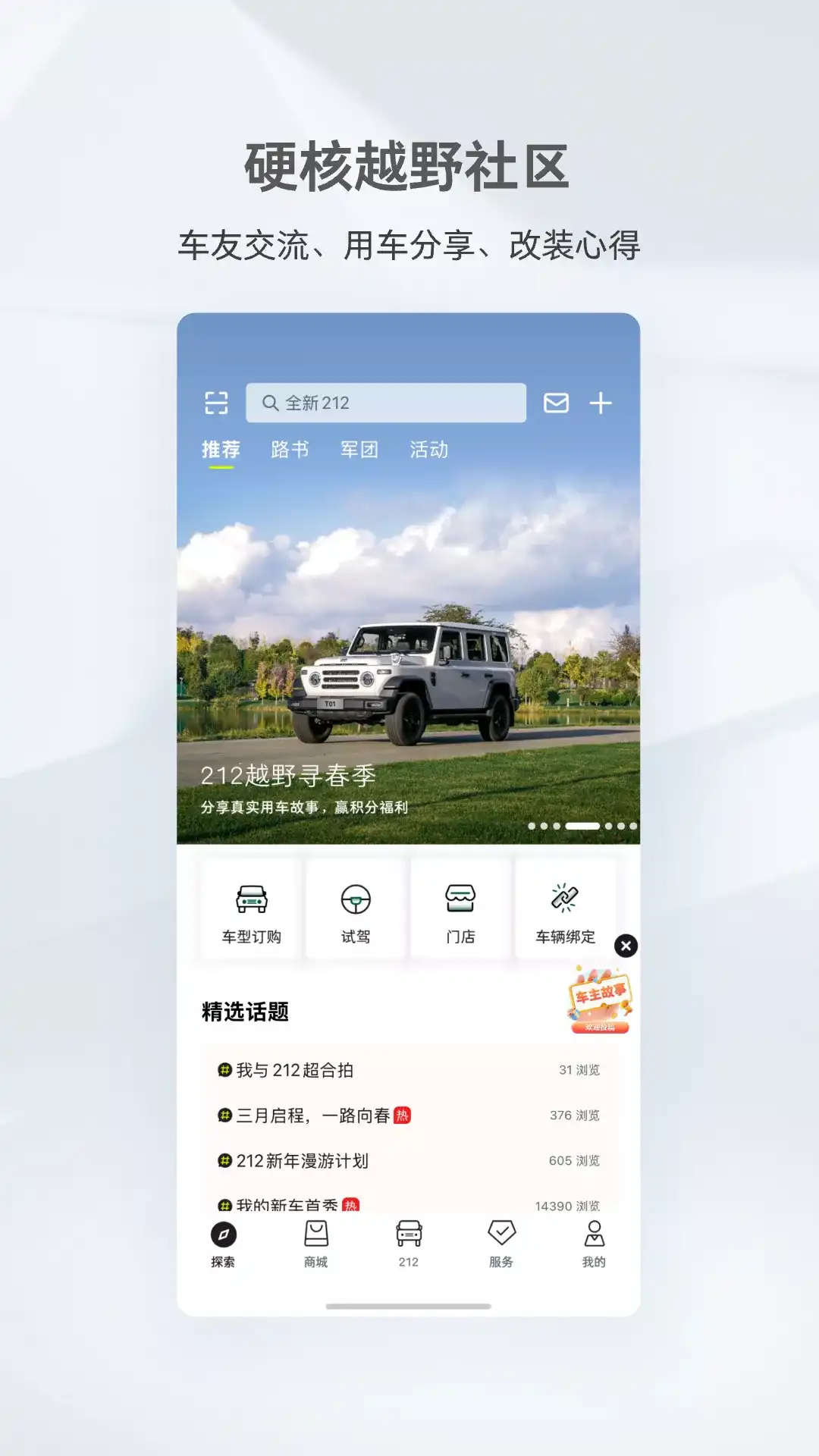 212越野车APP是为越野爱好者提供专业越野资源和互动的平台,我们致力于服务追求自由、探索和热爱的用户,在这里您将获得驾驶/改装/养护等知识,畅享智能服务,丰富社群生活,结识志同道合的伙伴,和更精彩的生活体验。